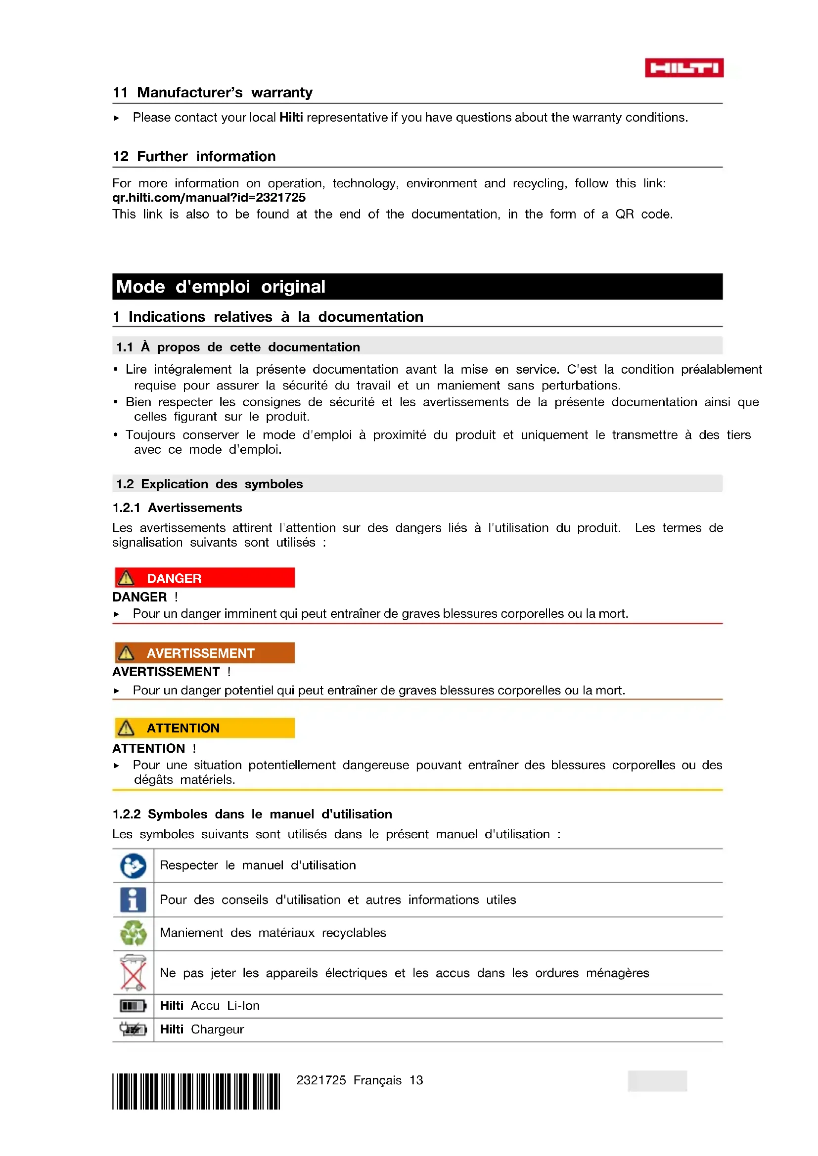 Les symboles suivants sont utilisés dans le présent manuel d'utilisation : Respecter le manuel d'utilisation Pour des conseils d'utilisation et autres informations utiles Maniement des matériaux recyclables Ne pas jeter les appareils électriques et les accus dans les ordures ménagères Hilti Accu Li-Ion Hilti Chargeur14 Français 2321725 *2321725*