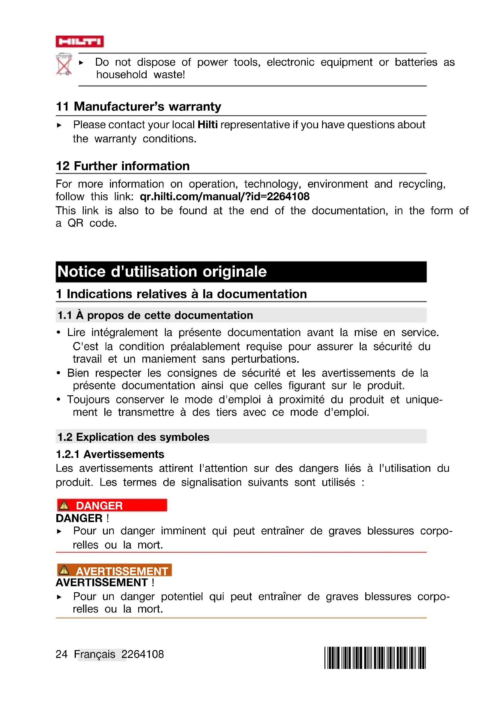 - Ne pas utiliser le produit en cas d'endommagements et/ou de dysfonc- tionnements. Faire immédiatement réparer le produit par le S.A.V. Hilti.*2264108* 2264108 Français 47