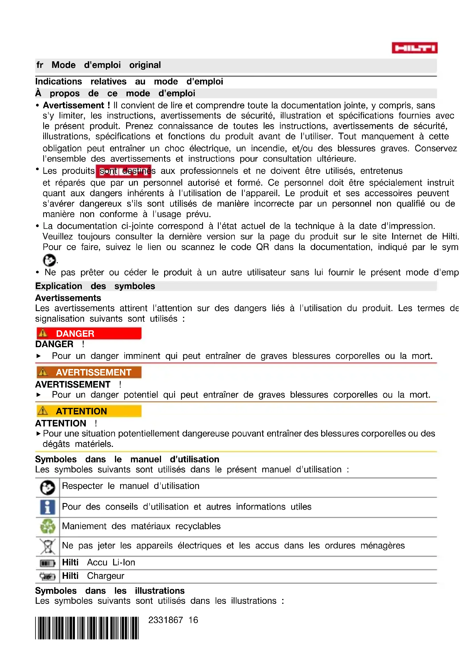 - Ne pas prêter ou céder le produit à un autre utilisateur sans lui fournir le présent mode d'emploi. Explication des symboles Avertissements Les avertissements attirent l'attention sur des dangers liés à l'utilisation du produit. Les termes de signalisation suivants sont utilisés : DANGER DANGER ! ▶ Pour un danger imminent qui peut entraîner de graves blessures corporelles ou la mort. AVERTISSEMENT AVERTISSEMENT ! ▶ Pour un danger potentiel qui peut entraîner de graves blessures corporelles ou la mort. ATTENTION ATTENTION ! ▶ Pour une situation potentiellement dangereuse pouvant entraîner des blessures corporelles ou des dégâts matériels. Symboles dans le manuel d'utilisation Les symboles suivants sont utilisés dans le présent manuel d'utilisation : Respecter le manuel d'utilisation Pour des conseils d'utilisation et autres informations utiles Maniement des matériaux recyclables Ne pas jeter les appareils électriques et les accus dans les ordures ménagères Hilti Accu Li-Ion Hilti Chargeur Symboles dans les illustrations Les symboles suivants sont utilisés dans les illustrations :17 2331867 *2331867* Ces chiffres renvoient à l'illustration correspondante au début du présent manuel d'utilisa- tion. La numérotation détermine la séquence des étapes de travail dans l'image et peut se diffé- rencier de celles des étapes de travail dans le texte. Les numéros de position sont utilisés dans l'illustration Vue d’ensemble et renvoient aux numéros des légendes dans la section Vue d'ensemble du produit. Ce signe doit inviter à manier le produit en faisant particulièrement attention. Symboles spécifiques au produit Symboles sur le produit Les symboles suivants peuvent être utilisés sur le produit : Le produit prend en charge la technologie NFC qui est compatible avec les plates-formes iOS et Android. Porter des lunettes de protection Toujours travailler avec les deux mains. Courant continu Accu lithium-ions Ne jamais utiliser l'accu comme outil de percussion. Ne pas laisser tomber l'accu. Ne pas utiliser d'accu ayant subi un choc ou d'autres dom- mages. Série de type d'accu Li-Ion Hilti utilisée. Observer les instructions au chapitre Utilisation conforme à l'usage prévu. Si présent sur le produit, c'est que le produit a été certifié conformément aux normes en vigueur par cet organisme de certification pour le marché nord-américain et canadien. Sécurité Indications générales de sécurité pour les appareils électriques AVERTISSEMENT Lire toutes les consignes de sécurité et instructions, illustrations et caractéristiques techniques, qui accompagnent cet outil électroportatif. Tout manquement à l'observation des instructions suivantes risque de provoquer une électrocution, un incendie et/ou de graves blessures. Les consignes de sécurité et instructions doivent être intégralement conservées pour les utilisations futures. La notion d'« outil électroportatif » mentionnée dans les consignes de sécurité se rapporte à des outils électriques raccordés au secteur (avec câble d'alimentation) et à des outils électriques sur accu (sans câble d'alimentation). Sécurité sur le lieu de travail ▶ Conserver la zone de travail propre et bien éclairée. Un lieu de travail en désordre ou mal éclairé augmente le risque d'accidents. ▶ Ne pas faire fonctionner les outils électriques en atmosphère explosive et où se trouvent des liquides, des gaz ou poussières inflammables. Les outils électriques produisent des étincelles qui peuvent enflammer les poussières ou les fumées. ▶ Maintenir les enfants et les personnes présentes à l'écart pendant l'utilisation de l'outil électroportatif. En cas d'inattention il y a risque de perdre le contrôle de l'appareil.*2331867*