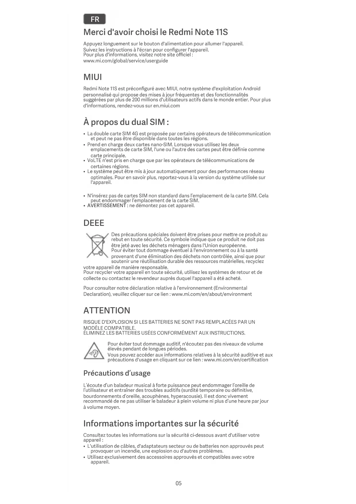 - AVERTISSEMENT : ne démontez pas cet appareil. DEEE Des précautions spéciales doivent être prises pour mere ce produit au rebut en toute sécurité. Ce symbole indique que ce produit ne doit pas être jeté avec les déchets ménagers dans l'Union européenne. Pour éviter tout dommage éventuel à l'environnement ou à la santé provenant d'une élimination des déchets non contrôlée, ainsi que pour soutenir une réutilisation durable des ressources matérielles, recyclez votre appareil de manière responsable. Pour recycler votre appareil en toute sécurité, utilisez les systèmes de retour et de collecte ou contactez le revendeur auprès duquel l'appareil a été acheté. Pour consulter notre déclaration relative à l'environnement (Environmental Declaration), veuillez cliquer sur ce lien : www.mi.com/en/about/environment ATTENTION RISQUE D'EXPLOSION SI LES BATTERIES NE SONT PAS REMPLACÉES PAR UN MODÈLE COMPATIBLE. ÉLIMINEZ LES BATTERIES USÉES CONFORMÉMENT AUX INSTRUCTIONS. Pour éviter tout dommage auditif, n'écoutez pas des niveaux de volume élevés pendant de longues périodes. Vous pouvez accéder aux informations relatives à la sécurité auditive et aux précautions d'usage en cliquant sur ce lien : www.mi.com/en/certification Précautions d’usage L’écoute d’un baladeur musical à forte puissance peut endommager l’oreille de l’utilisateur et entraîner des troubles auditifs (surdité temporaire ou définitive, bourdonnements d’oreille, acouphènes, hyperacousie). Il est donc vivement recommandé de ne pas utiliser le baladeur à plein volume ni plus d’une heure par jour à volume moyen. Informations importantes sur la sécurité Consultez toutes les informations sur la sécurité ci-dessous avant d'utiliser votre appareil :