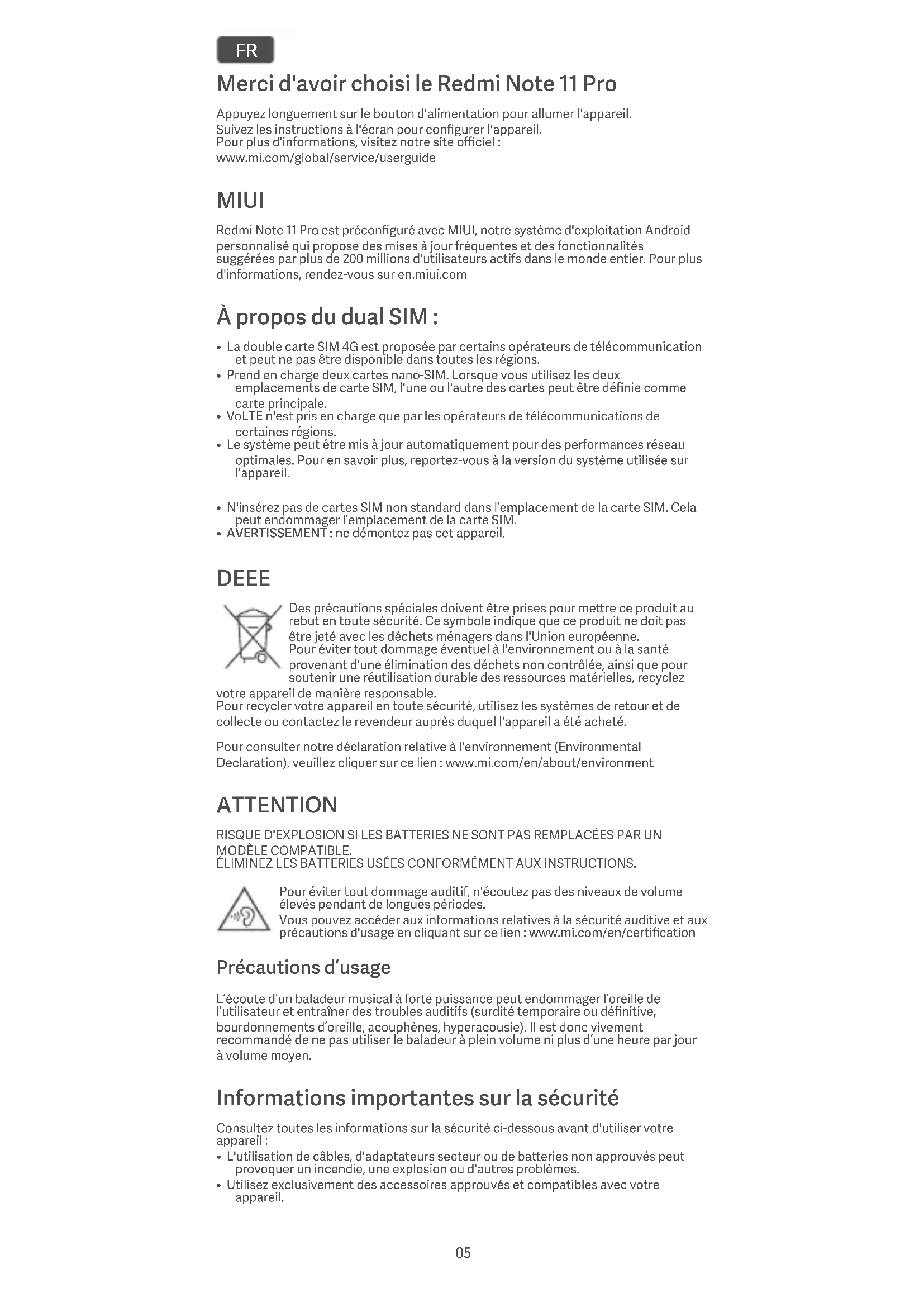 - AVERTISSEMENT : ne démontez pas cet appareil. DEEE Des précautions spéciales doivent être prises pour mere ce produit au rebut en toute sécurité. Ce symbole indique que ce produit ne doit pas être jeté avec les déchets ménagers dans l'Union européenne. Pour éviter tout dommage éventuel à l'environnement ou à la santé provenant d'une élimination des déchets non contrôlée, ainsi que pour soutenir une réutilisation durable des ressources matérielles, recyclez votre appareil de manière responsable. Pour recycler votre appareil en toute sécurité, utilisez les systèmes de retour et de collecte ou contactez le revendeur auprès duquel l'appareil a été acheté. Pour consulter notre déclaration relative à l'environnement (Environmental Declaration), veuillez cliquer sur ce lien : www.mi.com/en/about/environment ATTENTION RISQUE D'EXPLOSION SI LES BATTERIES NE SONT PAS REMPLACÉES PAR UN MODÈLE COMPATIBLE. ÉLIMINEZ LES BATTERIES USÉES CONFORMÉMENT AUX INSTRUCTIONS. Pour éviter tout dommage auditif, n'écoutez pas des niveaux de volume élevés pendant de longues périodes. Vous pouvez accéder aux informations relatives à la sécurité auditive et aux précautions d'usage en cliquant sur ce lien : www.mi.com/en/certification Précautions d’usage L’écoute d’un baladeur musical à forte puissance peut endommager l’oreille de l’utilisateur et entraîner des troubles auditifs (surdité temporaire ou définitive, bourdonnements d’oreille, acouphènes, hyperacousie). Il est donc vivement recommandé de ne pas utiliser le baladeur à plein volume ni plus d’une heure par jour à volume moyen. Informations importantes sur la sécurité Consultez toutes les informations sur la sécurité ci-dessous avant d'utiliser votre appareil :