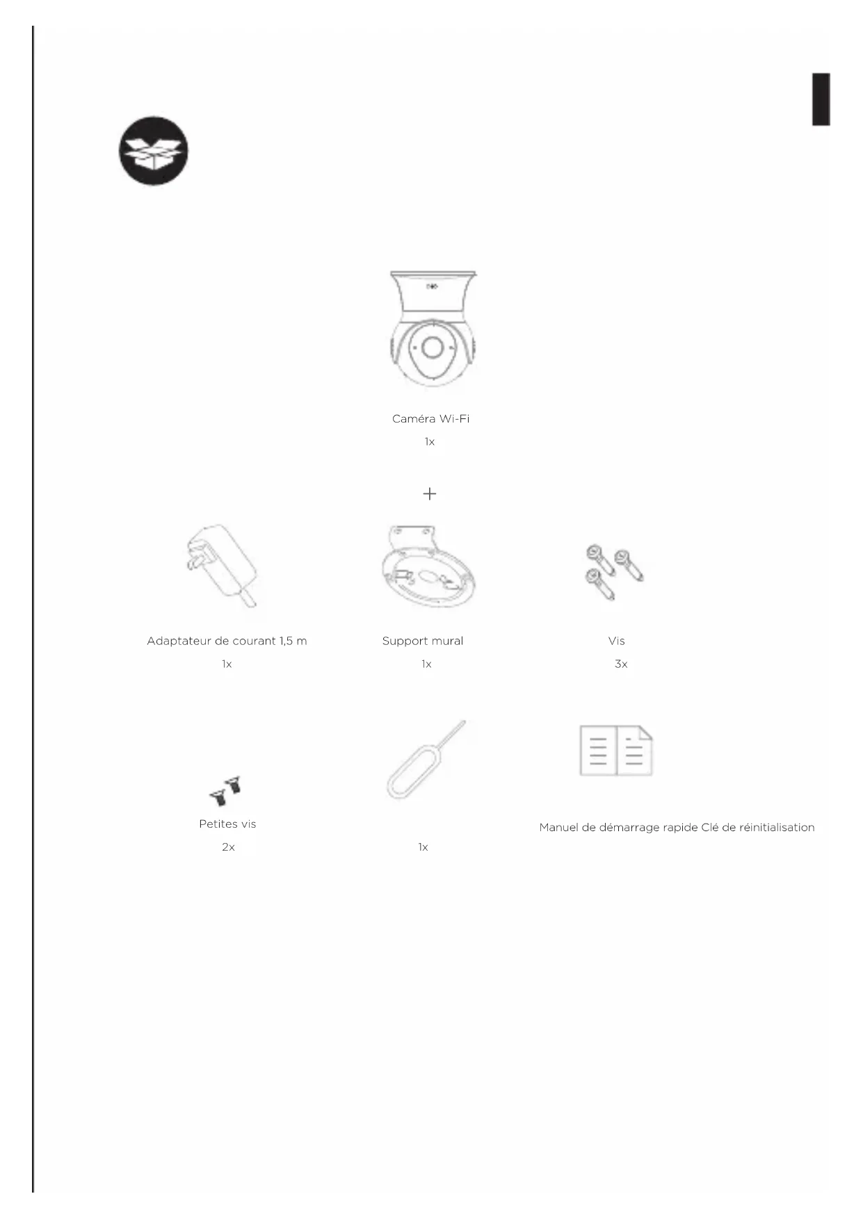 Attention : - Assurez-vous que le routeur Wi-Fi soit sur une bande 2,4GHz (ne fonctionne pas en 5GHz). - Lors de la conguration, votre smartphone doit être sur le même réseau Wi-Fi que la caméra. - Une caméra peut uniquement être ajoutée à un compte. Si la caméra a déjà été ajoutée, elle ne peut pas être ajoutée à un autre compte.1 Retirer la languette de protection de la lentille. 2 Si vous placez la caméra au plafond : - xer le support plastique au plafond à l’aide des vis fournies - visser la caméra sur le support 3 Si vous installez la caméra sur un mur vertical : - attacher le support métallique au support en plastique avec les deux petites vis fournies - xer le support au mur à l’aide des vis fournie (voir illustration) - visser la caméra sur le support