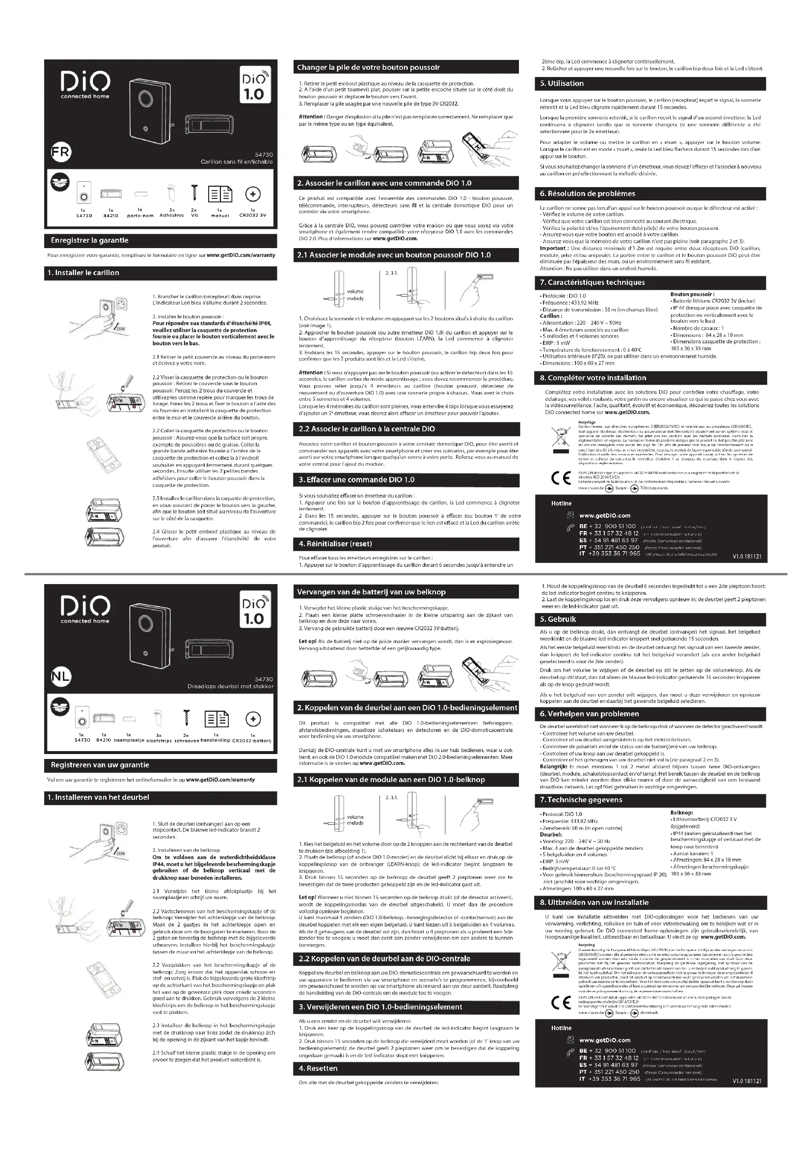 CHACON déclare que les appareils 54730 et 84210 sont conformes aux exigences et dispositions de la directive RED 2014/53/EU. Le texte complet de la déclaration UE de conformité est disponible à l’adresse internet suivante :www.chacon.be Support Téléchargements RecyclageConformément aux directives européennes DEEE(2002/96/EC) et relative aux accumulateurs (2006/66/EC), tout appareil électrique, électronique ou accumulateur doit être collecté séparément par un système local et spécialisé de collecte des déchets. Ne jetez pas ces produits avec les déchets ordinaires. Consultez la réglementation en vigueur. La marque en forme de poubelle indique que ce produit ne doit pas être jeté avec les ordures ménagères dans aucun des pays de l’UE. An de prévenir tout risque sur l’environnement ou la santé humaine lié à la mise au rebut incontrôlée, recyclez le produit de façon responsable an de promouvoir l’utilisation durable des ressources matérielles. Pour renvoyer votre appareil usagé, utilisez les systèmes de renvoi et collecte ou contactez le revendeur d’origine. Il se chargera du recyclage dans le respect des dispositions règlementaires. Enregistrer la garantie Pour enregistrer votre garantie, remplissez le formulaire en ligne sur www.getDiO.com/warranty Hotline BE + 32 900 51 100 (Tarif nat. / Nat. tarief : 0,45€/min) FR + 33 1 57 32 48 12 (Prix communication nationale) ES + 34 91 481 63 97 (Precio Comunicación Nacional) PT + 351 221 450 250 (Preço Comunicação Nacional) IT +39 353 36 71 965 (Al prezzo di una telefonata nazionale) V1.0 181121 www.getDiO.com