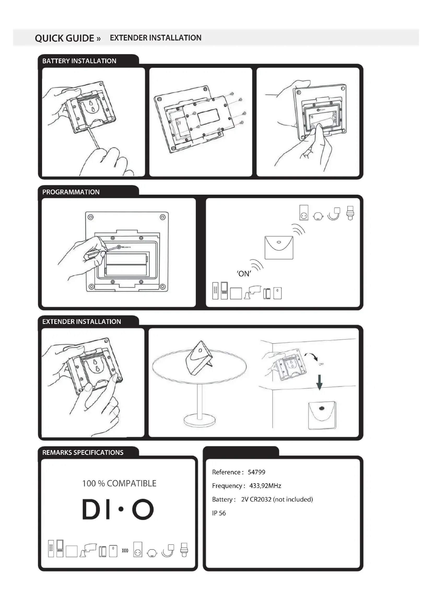 BATTERY INSTALLATION PROGRAMMATION EXTENDER INSTALLATION REMARKS SPECIFICATIONS QUICK GUIDE » EXTENDER INSTALLATION Reference : 54799 Frequency : 433,92MHz Battery : 2V CR2032 (not included) IP 56 ‘ON’ 100 % COMPATIBLEFR –Relais (54799) Installer le relais : 1° Utiliser un tournevis plat pour retirer le couvercle et ouvrir le compartiment à piles (8 vis). 2° Mettre 2 piles AA 1.5V (non fournies), la lumière LED s’allume 1seconde puis s’éteint pour entrer en mode stand-by. 3° Relier le relais avec l’émetteur (voir Apprentissage du code). 4° Fermer le compartiment à piles avec les vis et remettre le couvercle. 5° Accrocher le relais au mur ou le déposer sur un meuble de sorte qu’il soit situé 6° Le relais est IP56 pour une utilisation intérieure ou extérieure. entre l’émetteur et le récepteur. Apprentissage du code: 1° Insérer la pile, la led du relais s’allume 1 seconde puis s’éteint pour entrer en mode stand-by. 2° Appuyer le bouton ‘Learn’ du relais, la led clignote rapidement. 3° Appuyer sur le bouton ‘ON’ de l’émetteur. 4° La led du relais clignote deux fois pour confirmer. Jusqu’à six programmations sont possibles. Répéter les étapes 2 à 4 pour programmer les espaces mémoires disponibles. cer un seul code: 1° Appuyer sur le bouton ‘learn’ du relais, la led clignote rapidement. 2° Appuyer sur le bouton ‘OFF’ de l’émetteur correspondant au c cer. 3° La led du relais clignote deux fois pour confirmer la suppression. cer tous les codes: 1° Appuyer sur le bouton ‘learn’ du relais pendant 6 secondes, la led clignote rapidement. 2° Relâcher le bouton ‘learn’ et appuyer une nouvelle fois dessus. La led clignote deux fois pour confirmer la suppression des 6 codes mémorisés. Notice: - Eviter d’avoir plusieurs relais ayant un même code dans un même périmètre de fonctionnement (30m) pour ne pas qu’ils s’envoient le code l’un à l’autre de manière continue. - Si la led du relais clignote continuellement toutes les 3 secondes, cela signifie que la pile s’épuise. Remplacer la pile endéans les 7 jours, avant qu’elle ne soit totalement épuisée. - Si le relais est installé dans le champ de transmission entre l’émetteur et le récepteur, le récepteur peut recevoir le code de l’émetteur et du relais, ce qui peut perturber le bon fonctionnement du récepteur. Dans le cas d’utilisation d’une prise ou d’un module dimmer, celle-ci (celui-ci) peut recevoir deux signaux et commencera donc à dimmer. - La portée entre récepteur et émetteur est de 50m, mais celle-ci peut être diminuée par l’épaisseur des murs ou un environnement sans fil existant. IMPORTANT (Directive 2002/96/EC WEEE) : Lors du triage de vos déchets, nous vous prions de respecter la réglementation en vigueur quant à leur élimination. Nous vous remercions de les déposer dans un endroit prévu à cet e et et dans le respect de l’environnement. NL – Relais (54799) Het relais installeren : 1° Gebruik een platte schroevendraaier om het deksel te verwijderen en het batterijcompartiment te openen (8 schroeven). 2° Plaats 2 AA 1.5V batterijen (niet bijgeleverd), het LED-lampje licht één seconde op, gaat weer uit en komt in stand-by te staan. 3° Verbind het relais met de zender (zie De code leren). 4° Sluit het batterijcompartiment met de schroeven en plaats het deksel er terug op. 5° Hang het relais aan de muur of leg het op een meubel, zodat het zich tussen de zender en de ontvanger bevindt. De code leren: 1° Plaats de batterij, het LED-lampje van het relais licht één seconde op, gaat weer uit en komt in stand-by te staan.. 2° Druk op de ‘Learn’ knop van het relais. De LED knippert snel. 3° Druk op de ‘ON’-knop van de zender. 4° De LED van het relais knippert twee maal om te confirmeren. Er zijn maximum zes programmeringen mogelijk. Herhaal de stappen van 2 tot 4 om het beschikbare geheugen te programmeren. Een code wissen: 1° Druk op de leerknop van het relais, de LED knippert langzaam. 2° Druk op de OFF-knop van de zender die overeenkomt met de te wissen code. 3° De code is gewist en de LED van het relais knippert twee maal om te bevesti