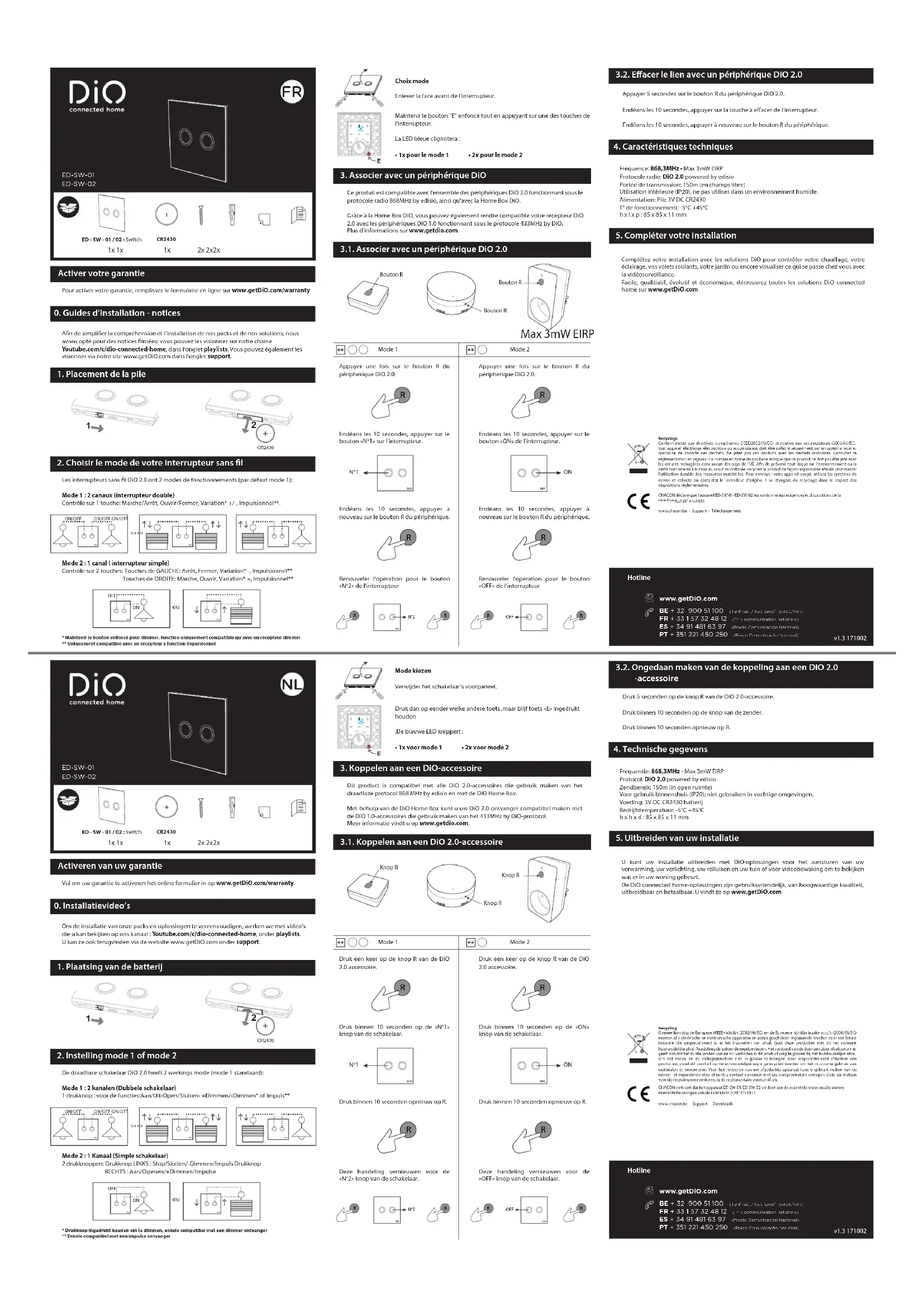 Max 3mW EIRP Fréquence: 868,3MHz - Max 3mW EIRPProtocole radio: DiO 2.0 powered by edisioPortée de transmission: 150m (en champs libre)Utilisation intérieure (IP20), ne pas utiliser dans un environnement humide.Alimentation: Pile 3V DC CR2430T° de fonctionnement: -5°C +45°Ch x l x p : 85 x 85 x 11 mm CHACON déclare que l’appareil ED-SW-01/ED-SW-02 est conforme aux exigences et dispositions de la directive RED 2014/53/EU:www.chacon.be - Support - TéléchargementRecyclageConformément aux directives européennes DEEE(2002/96/EC) et relative aux accumulateurs (2006/66/EC), tout appareil électrique, électronique ou accumulateur doit être collecté séparément par un système local et spécialisé de collecte des déchets. Ne jetez pas ces produits avec les déchets ordinaires. Consultez la réglementation en vigueur. La marque en forme de poubelle indique que ce produit ne doit pas être jeté avec les ordures ménagères dans aucun des pays de l’UE. An de prévenir tout risque sur l’environnement ou la santé humaine lié à la mise au rebut incontrôlée, recyclez le produit de façon responsable an de promouvoir l’utilisation durable des ressources matérielles. Pour renvoyer votre appareil usagé, utilisez les systèmes de renvoi et collecte ou contactez le revendeur d’origine. Il se chargera du recyclage dans le respect des dispositions règlementaires. Activer votre garantie Pour activer votre garantie, remplissez le formulaire en ligne sur www.getDiO.com/warranty Les interrupteurs sans l DiO 2.0 ont 2 modes de fonctionnements (par défaut mode 1):Mode 1 : 2 canaux (interrupteur double)Contrôle sur 1 touche: Marche/Arrêt, Ouvrir/Fermer, Variation* +/-, Impulsionnel**.* Maintenir le bouton enfoncé pour dimmer, fonction uniquement compatible qu’avec un récepteur dimmer** Uniquement compatible avec un récepteur à fonction impulsionnelMode 2 : 1 canal ( interrupteur simple)Contrôle sur 2 touches: Touches de GAUCHE: Arrêt, Fermer, Variation* -, Impulsionnel** Touches de DROITE: Marche, Ouvrir, Variation* +, Impulsionnel**Choix modeEnlever la face avant de l’interrupteur.Maintenir le bouton "E" enfoncé tout en appuyant sur une des touches de l’interrupteur.La LED bleue clignotera :