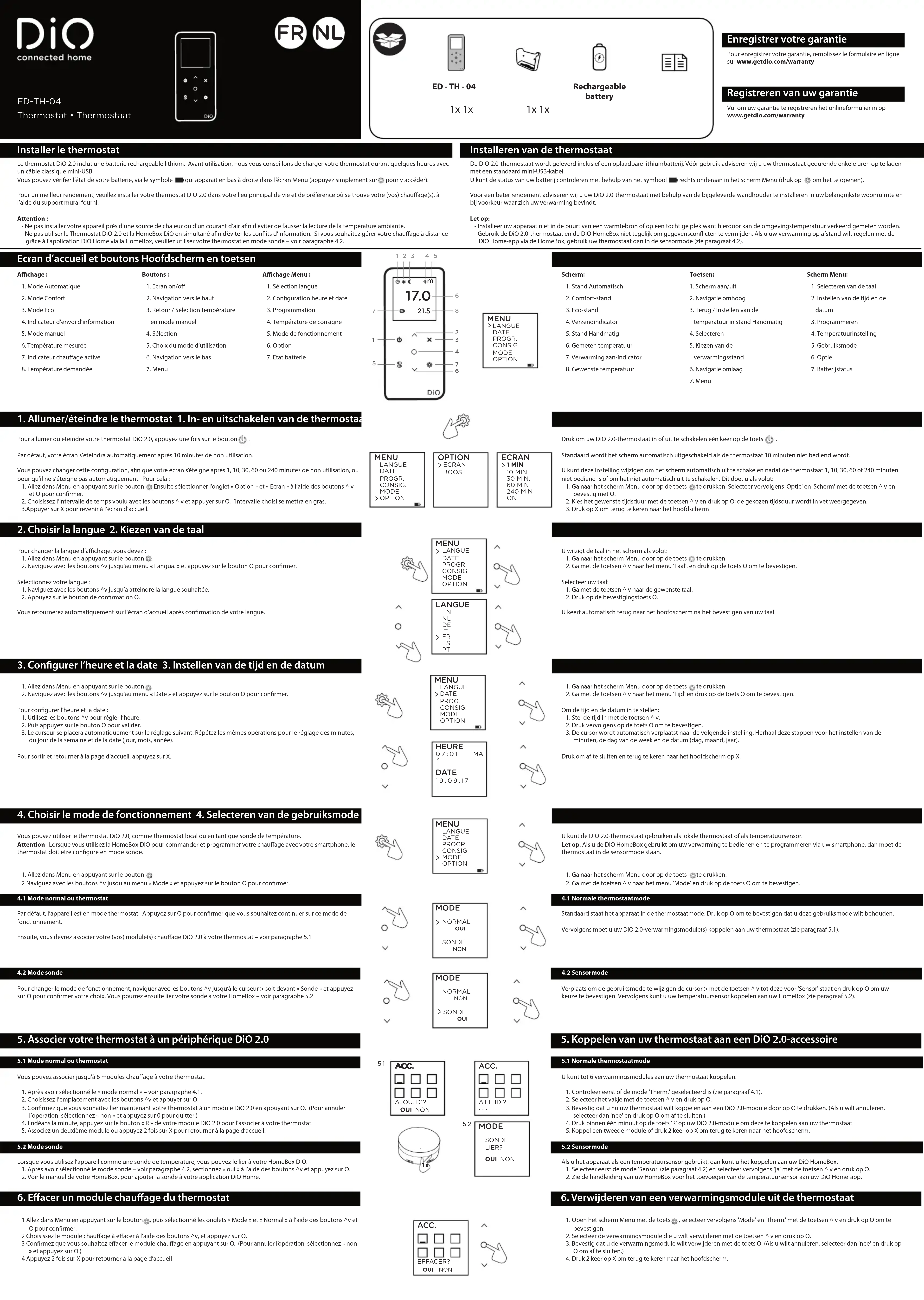 ED-TH-04 Thermostat • Thermostaat NLFR 1x 1x RechargeablebatteryED - TH - 04 1x 1x Enregistrer votre garantie Pour enregistrer votre garantie, remplissez le formulaire en ligne sur www.getdio.com/warranty Registreren van uw garantie Vul om uw garantie te registreren het onlineformulier in op www.getdio.com/warranty Installer le thermostat Le thermostat DiO 2.0 inclut une batterie rechargeable lithium. Avant utilisation, nous vous conseillons de charger votre thermostat durant quelques heures avec un câble classique mini-USB. Vous pouvez vérier l’état de votre batterie, via le symbole qui apparait en bas à droite dans l’écran Menu (appuyez simplement sur pour y accéder). Pour un meilleur rendement, veuillez installer votre thermostat DiO 2.0 dans votre lieu principal de vie et de préférence où se trouve votre (vos) chauage(s), à l’aide du support mural fourni. Attention : - Ne pas installer votre appareil près d’une source de chaleur ou d’un courant d’air an d’éviter de fausser la lecture de la température ambiante. - Ne pas utiliser le Thermostat DiO 2.0 et la HomeBox DiO en simultané an d’éviter les conits d’information. Si vous souhaitez gérer votre chauage à distance grâce à l’application DiO Home via la HomeBox, veuillez utiliser votre thermostat en mode sonde – voir paragraphe 4.2. Pour allumer ou éteindre votre thermostat DiO 2.0, appuyez une fois sur le bouton . Druk om uw DiO 2.0-thermostaat in of uit te schakelen één keer op de toets . Par défaut, votre écran s’éteindra automatiquement après 10 minutes de non utilisation. Vous pouvez changer cette conguration, an que votre écran s’éteigne après 1, 10, 30, 60 ou 240 minutes de non utilisation, ou pour qu’il ne s’éteigne pas automatiquement. Pour cela : 1. Allez dans Menu en appuyant sur le bouton . Ensuite sélectionner l’onglet « Option » et « Ecran » à l’aide des boutons ^ v et O pour conrmer. 2. Choisissez l’intervalle de temps voulu avec les boutons ^ v et appuyer sur O, l’intervalle choisi se mettra en gras. 3.Appuyer sur X pour revenir à l’écran d’accueil. Pour changer la langue d’achage, vous devez : 1. Allez dans Menu en appuyant sur le bouton . 2. Naviguez avec les boutons ^v jusqu’au menu « Langua. » et appuyez sur le bouton O pour conrmer. Sélectionnez votre langue : 1. Naviguez avec les boutons ^v jusqu’à atteindre la langue souhaitée.2. Appuyez sur le bouton de conrmation O. Vous retournerez automatiquement sur l’écran d’accueil après conrmation de votre langue. Installeren van de thermostaat Ecran d’accueil et boutons Hoofdscherm en toetsen