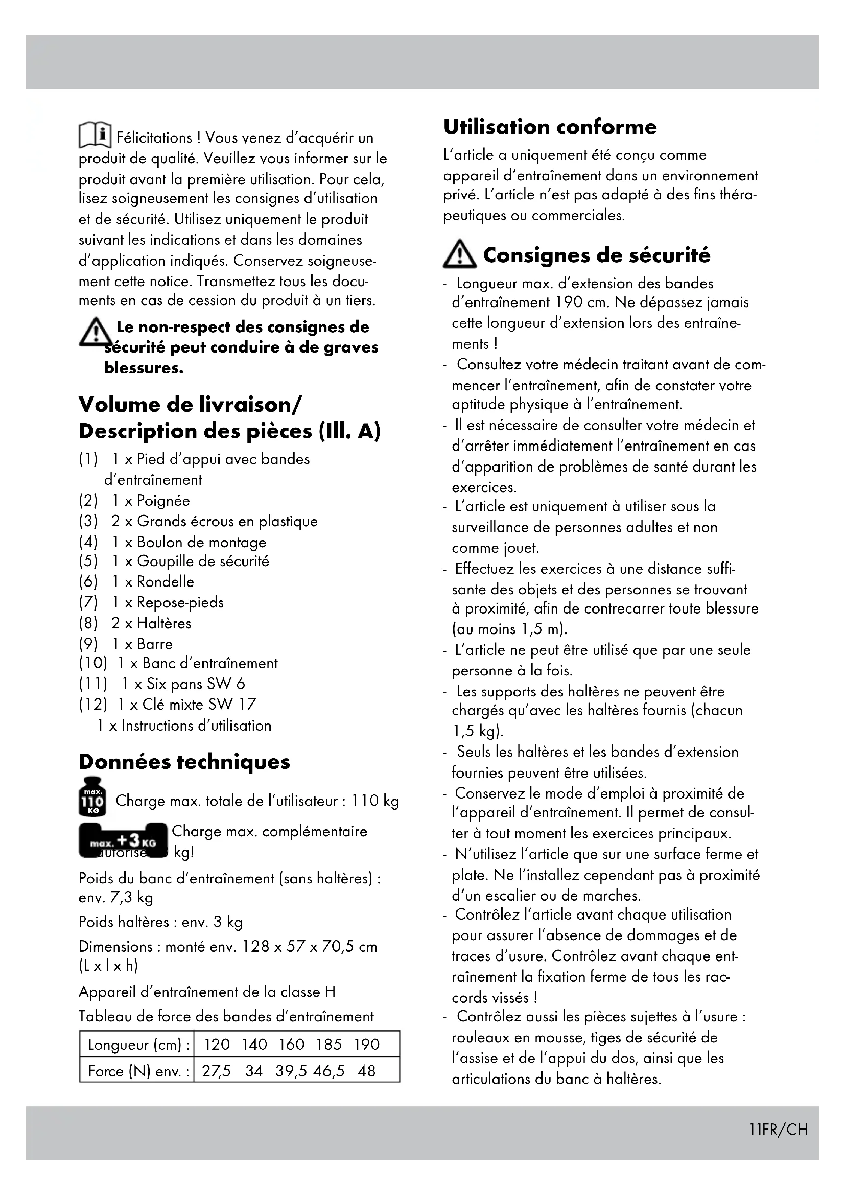 Charge max. totale de l’utilisateur : 110 kg Charge max. complémentaire autorisée 3 kg! Poids du banc d’entraînement (sans haltères) : env. 7,3 kg Poids haltères : env. 3 kg Dimensions : monté env. 128 x 57 x 70,5 cm (L x l x h) Appareil d’entraînement de la classe H Tableau de force des bandes d’entraînement Longueur (cm) : 120 140 160 185 190 Force (N) env. : 27,5 34 39,5 46,5 48 Utilisation conforme L‘article a uniquement été conçu comme appareil d‘entraînement dans un environnement privé. L‘article n‘est pas adapté à des fins théra- peutiques ou commerciales. Consignes de sécurité - Longueur max. d’extension des bandes d’entraînement 190 cm. Ne dépassez jamais cette longueur d’extension lors des entraîne- ments ! - Consultez votre médecin traitant avant de com- mencer l‘entraînement, afin de constater votre aptitude physique à l‘entraînement. - Il est nécessaire de consulter votre médecin et d‘arrêter immédiatement l‘entraînement en cas d‘apparition de problèmes de santé durant les exercices. - L‘article est uniquement à utiliser sous la surveillance de personnes adultes et non comme jouet. - Effectuez les exercices à une distance suffi- sante des objets et des personnes se trouvant à proximité, afin de contrecarrer toute blessure (au moins 1,5 m). - L‘article ne peut être utilisé que par une seule personne à la fois. - Les supports des haltères ne peuvent être chargés qu’avec les haltères fournis (chacun 1,5 kg). - Seuls les haltères et les bandes d’extension fournies peuvent être utilisées. - Conservez le mode d‘emploi à proximité de l‘appareil d‘entraînement. Il permet de consul- ter à tout moment les exercices principaux. - N‘utilisez l‘article que sur une surface ferme et plate. Ne l‘installez cependant pas à proximité d‘un escalier ou de marches. - Contrôlez l‘article avant chaque utilisation pour assurer l‘absence de dommages et de traces d‘usure. Contrôlez avant chaque ent- raînement la fixation ferme de tous les rac- cords vissés ! - Contrôlez aussi les pièces sujettes à l‘usure : rouleaux en mousse, tiges de sécurité de l‘assise et de l‘appui du dos, ainsi que les articulations du banc à haltères.12 FR/CH Étape 3 (Ill. F) Fixez le tube d’appui (1/9) avec le boulon de montage fourni (4) et serrez-le fermement. Étape 4 (Ill. G) Fixez ensuite la goupille de sécurité (5) comme illustré. Attention ! La goupille contrecarre le rabattement complet du pied d‘appui. Étape 5 (Ill. H) Fixez la poignée (2) au bout supérieur du pied d’appui (1/9), fixez-le ensuite avec le 2ème écrou en plastique (3) et la rondelle (6) fournis. Attention ! Fixez la poignée (2) pour l’exercice K et N avec la vis de réglage montrant vers l’extérieur. La vis de réglage montre vers le support du banc pour tous les autres exercices. Étape 6 Un support de rangement pour les haltères se trouve sous le banc d’entraînement. Tournez les supports vers le bas et vissez-les fermement avec la clé à six pans creux (11) fournie. Mécanisme de rabattement Retirez la goupille de sécurité (5) et glissez le pied d’appui légèrement vers l’avant afin de rabattre le pied d’appui vers l‘intérieur. Consignes générales d‘entraînement - Les exercices suivants ne sont qu’une sélection. Des exercices supplémentaires sont à trouver dans la littérature spécialisée correspondante. - Portez des vêtements et des chaussures de sport. - Réchauffez-vous avant chaque entraînement et terminez l’entraînement lentement. - Intensifiez lentement l’intensité de l’entraînement et veillez à faire des pauses suffisantes entre les exercices. - Réalisez les exercices de manière régulière. Respirez profondément. - Réalisez les exercices de manière régulière, et non brusquement et rapidement. - Veillez à exercer une respiration régulière. Expirez pendant l‘effort et inspirez au repos. - Des problèmes de santé peuvent survenir en cas d‘entraînement incorrect ou excessif. - L‘article ne peut être utilisé que dans un parfait état. N‘utilisez que des pièces de rechange d‘origine. - Les parents et autres personnes de surveillance doivent être conscients de leur responsabilité, étant donné que l‘enjouement et la tendance naturels à l’expérimentation des enfants peuvent engendrer des situations et des com- portements pour lesquels l‘appareil n‘a pas été conçu. - Si vous laisser des enfants à proximité de l’appareil, vous devez impérativement prendre en compte leur développement mental et corporel, et surtout leur tempérament. Surveillez les enfants et montrez-leur surtout l’utilisation correcte de l’appareil. Cet appareil d’entraînement n’est en aucun cas à utiliser comme jouet. - Veillez à installer un support correspondant sur des sols sensibles, afin de protéger le sol des endommagements. Montage Le banc d‘entraînement est en grande partie déjà prémonté. Seul le pied d‘appui avant doit y être monté. Outil nécessaire 1 x Six pans creux SW 6 1 x Clé mixte SW 17 Étape 1 (Ill. B, C, D) Poussez le pied d’appui (1) dans la barre (9) et fixez-la avec le repose-pied (7) et l’écrou en plastique (3). Étape 2 (Ill. E) Montez alors le tube d’appui au banc d’entraînement (10).13FR/CH Descendez lentement le haut du corps en contractant les muscles ventraux, jusqu’à ce que le haut du corps se trouve parallèlement avec le sol. Conservez la contraction et levez le haut du corps à env. 45°, redescendez-le ensuite alors à nouveau lentement. Attention ! Veillez impérativement à ne pas faire de dos creux. Exercice 2 (Ill. J) Avec cet exercice, vous entraînez les muscles ventraux se trouvant à l’avant et sur les côtés. Réglez à nouveau la hauteur du pied d’appui avant de façon à pouvoir fixer vos pieds à la barre transversale rembourrée inférieure et posez simultanément l