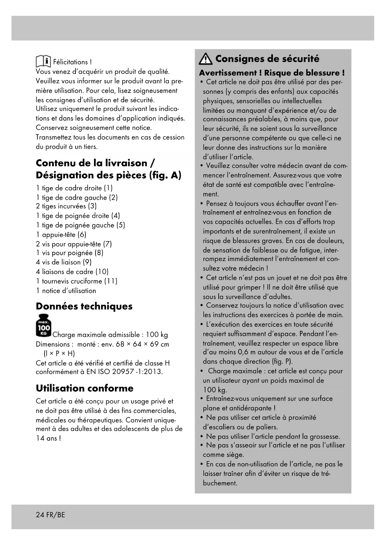 - Veillez à ce que les éléments non utilisés ne se trouvent pas dans votre zone d‘entraînement. Soyez particulièrement prudent : risque de blessure pour les enfants !