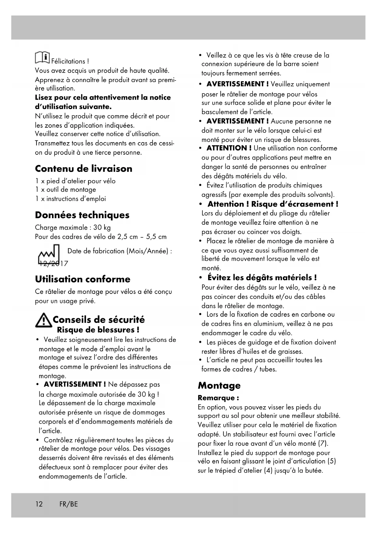 - L’article ne peut pas accueillir toutes les formes de cadres / tubes. Montage Remarque : En option, vous pouvez visser les pieds du support au sol pour obtenir une meilleur stabilité. Veuillez utiliser pour cela le matériel de fixation adapté. Un stabilisateur est fourni avec l‘article pour fixer la roue avant d‘un vélo monté (7). Installez le pied du support de montage pour vélo en faisant glissant le joint d‘articulation (5) sur le trépied d‘atelier (4) jusqu‘à la butée. FR/BE13 Dépliez le levier de serrage rapide et tournez-le dans le sens antihoraire pour ouvrir le dispositif de serrage (image F). Placez le cadre du vélo dans le dispositif de serrage et tournez le levier de serrage rapide dans le sens horaire jusqu‘à ce qu‘il puisse être manœuvré avec force (image F). Veillez à ce que la force de serrage soit suffi- sante. Remarque : Si le levier de serrage rapide se laisse manœuvrer trop facilement, la force de serrage est insuffisante. Dans ce cas, repoussez le levier de serrage rapide dans la position d‘ouverture et tournez-le à nouveau dans le sens horaire pour augmenter la force de serrage. Refermez le serrage rapide. Si le levier de serrage rapide ne se laisse pas manœuvrer, la force de serrage est trop forte. Réduisez la force de serrage en tournant le levier dans le sens antihoraire. Desserrez le dispositif de serrage d‘un demi-tour puis, essa- yez de fermer le serrage rapide. Répétez cette opération jusqu‘à ce que vous trouviez la force de serrage maximale à laquelle le levier puisse encore être manœuvré.