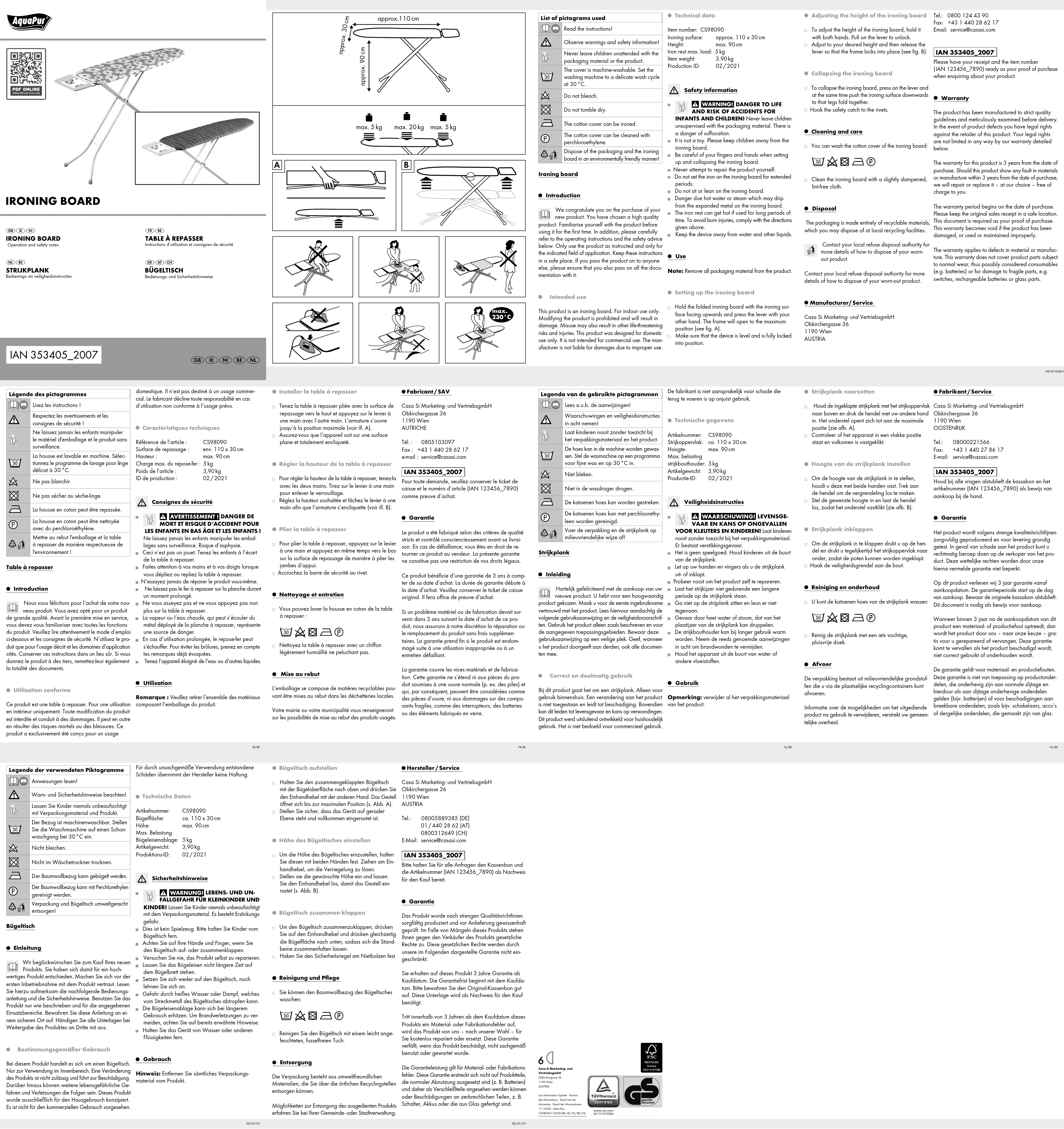 max. 5 kg max. 20 kg max. 230 °C FR/BE NL/BEFR/BE NL/BE Installer la table à repasser Tenez la table à repasser pliée avec la surface de repassage vers le haut et appuyez sur le levier à une main avec l‘autre main. L‘armature s‘ouvre jusqu‘à la position maximale (voir ill. A). Assurez-vous que l‘appareil soit sur une surface plane et totalement encliqueté. Régler la hauteur de la table à repasser Pour régler la hauteur de la table à repasser, tenez-la avec les deux mains. Tirez sur le levier à une main pour enlever le verrouillage. Réglez la hauteur souhaitée et lâchez le levier à une main afin que l‘armature s‘encliquette (voir ill. B). Plier la table à repasser Pour plier la table à repasser, appuyez sur le levier à une main et appuyez en même temps vers le bas sur la surface de repassage de manière à plier les jambes d‘appui. Accrochez la barre de sécurité au rivet. Nettoyage et entretien Vous pouvez laver la housse en coton de la table à repasser : Nettoyez la table à repasser avec un chiffon légèrement humidifié ne peluchant pas. Mise au rebut L’emballage se compose de matières recyclables pou- vant être mises au rebut dans les déchetteries locales. Votre mairie ou votre municipalité vous renseigneront sur les possibilités de mise au rebut des produits usagés. Fabricant / SAV Casa Si Marketing- und VertriebsgmbH Obkirchergasse 36 1190 Wien AUTRICHE Tél. : 0805103097 Fax : +43 1 440 28 62 17 e-mail : service@casasi.com IAN 353405_2007 Pour toute demande, veuillez conserver le ticket de caisse et le numéro d‘article (IAN 123456_7890) comme preuve d‘achat. Garantie Le produit a été fabriqué selon des critères de qualité stricts et contrôlé consciencieusement avant sa livrai- son. En cas de défaillance, vous êtes en droit de re- tourner ce produit au vendeur. La présente garantie ne constitue pas une restriction de vos droits légaux. Ce produit bénéficie d‘une garantie de 3 ans à comp- ter de sa date d’achat. La durée de garantie débute à la date d’achat. Veuillez conserver le ticket de caisse original. Il fera office de preuve d’achat. Si un problème matériel ou de fabrication devait sur- venir dans 3 ans suivant la date d‘achat de ce pro- duit, nous assurons à notre discrétion la réparation ou le remplacement du produit sans frais supplémen- taires. La garantie prend fin si le produit est endom- magé suite à une utilisation inappropriée ou à un entretien défaillant. La garantie couvre les vices matériels et de fabrica- tion. Cette garantie ne s’étend ni aux pièces du pro- duit soumises à une usure normale (p. ex. des piles) et qui, par conséquent, peuvent être considérées comme des pièces d’usure, ni aux dommages sur des compo- sants fragiles, comme des interrupteurs, des batteries ou des éléments fabriqués en verre. Légende des pictogrammes Lisez les instructions! Respectez les avertissements et les consign es de sécurité! Ne laissez jamais les enfants manipuler le matériel d'emballage et le produit sans surveillance. La housse est lavable en machine. Sélec-