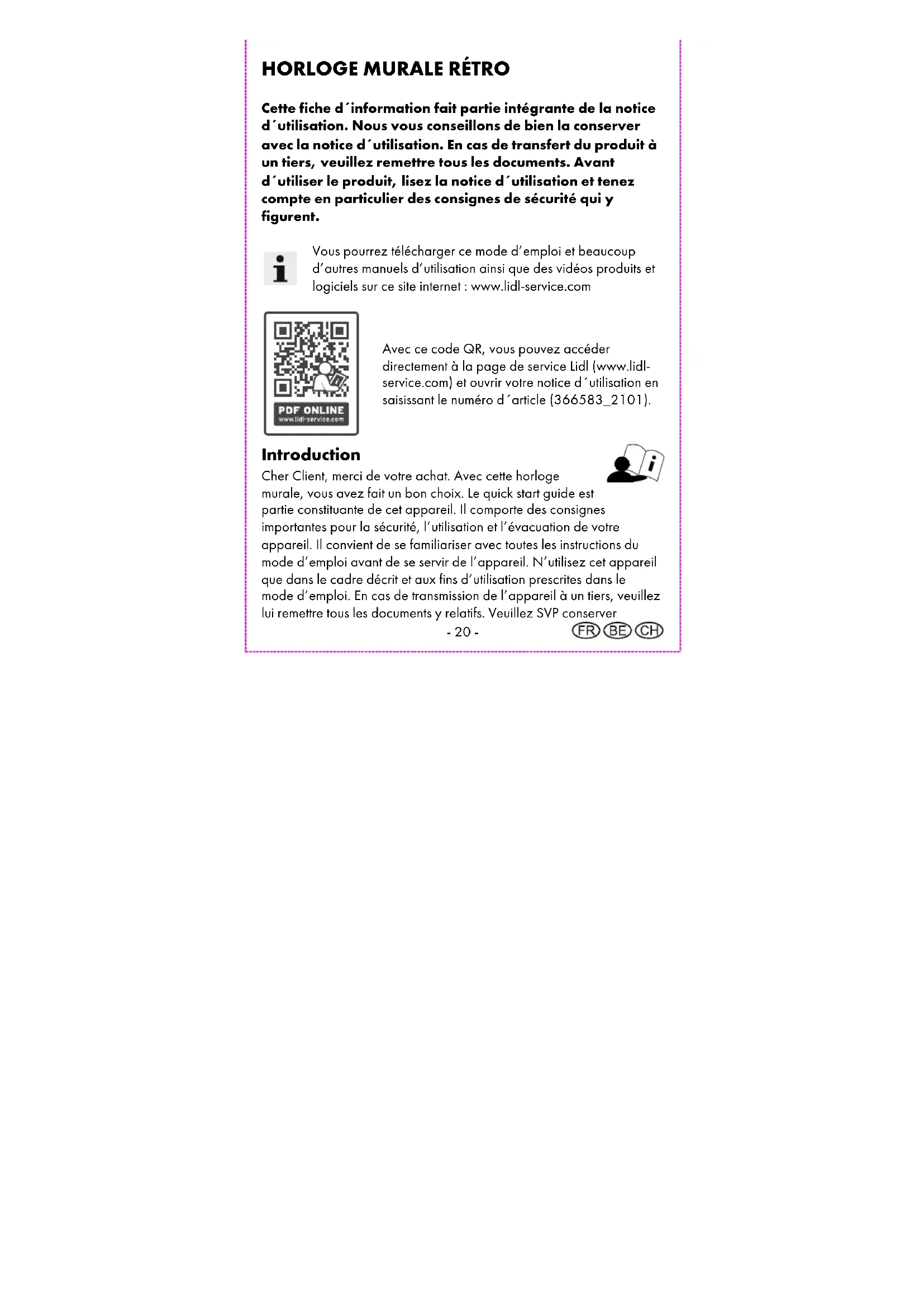 Avec ce code QR, vous pouvez accéder directement à la page de service Lidl (www.lidl- service.com) et ouvrir votre notice d´utilisation en saisissant le numéro d´article (366583_2101). Introduction Cher Client, merci de votre achat. Avec cette horloge murale, vous avez fait un bon choix. Le quick start guide est partie constituante de cet appareil. Il comporte des consignes importantes pour la sécurité, l’utilisation et l’évacuation de votre appareil. Il convient de se familiariser avec toutes les instructions du mode d’emploi avant de se servir de l’appareil. N’utilisez cet appareil que dans le cadre décrit et aux fins d’utilisation prescrites dans le mode d’emploi. En cas de transmission de l’appareil à un tiers, veuillez lui remettre tous les documents y relatifs. Veuillez SVP conserver- 21 - emballage et quick start guide pour d'éventuelles demandes d'informations ultérieures. Utilisation conforme Cette horloge murale a été conçue pour afficher l’heure. Toute autre utilisation ou modification de cet appareil sera considérée comme non conforme. Le fabricant ne pourra être tenu responsable d’un dommage causé par l’utilisation non conforme ou inappropriée de l’appareil. Cette horloge murale n’est pas destinée à des fins d’utilisation commerciale. Légende