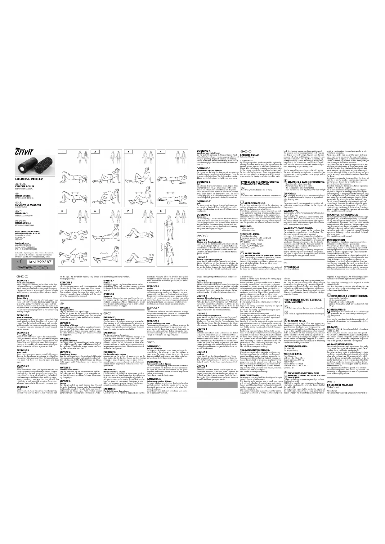 D‘UTILISATION ET DE MONTAGE : Ce symbole vous signale les risques de blessures. Les informations complémentaires sont caracté- risées ainsi. UTILISATION CONFORME : L’appareil d’entraînement convient pour augmenter la circulation sanguine des muscles, faire un auto-mas- sage, détendre les contractions et les fascias collés ainsi que pour stimuler la régénération. L’appareil d’entraînement est conçu pour l’usage privé et ne convient pas pour l’usage médical et industriel. Toute autre utilisation ou modification du produit est considérée comme non-conforme aux dispositions et peut entraîner des risques, des blessures et des dom- mages. Le responsable de la mise en circulation décline toute responsabilité pour les dommages résultant d'une utilisation non-conforme aux dispositions. Le produit n’est pas destiné à l’usage industriel. CONTENU DE LA LIVRAISON : 1 rouleau de massage 1 mode d’emploi CARACTÉRISTIQUES TECHNIQUES : Type : rouleau de massage Dimensions : env. 14 x 33 cm (Ø x L) Poids max. de l’utilisateur : 100 kg IAN 292887 Art. n° 60025 / 60026 Version : PO30000266 / 2017 Garantie : 3 ans CONSIGNES DE SÉCURITÉ !