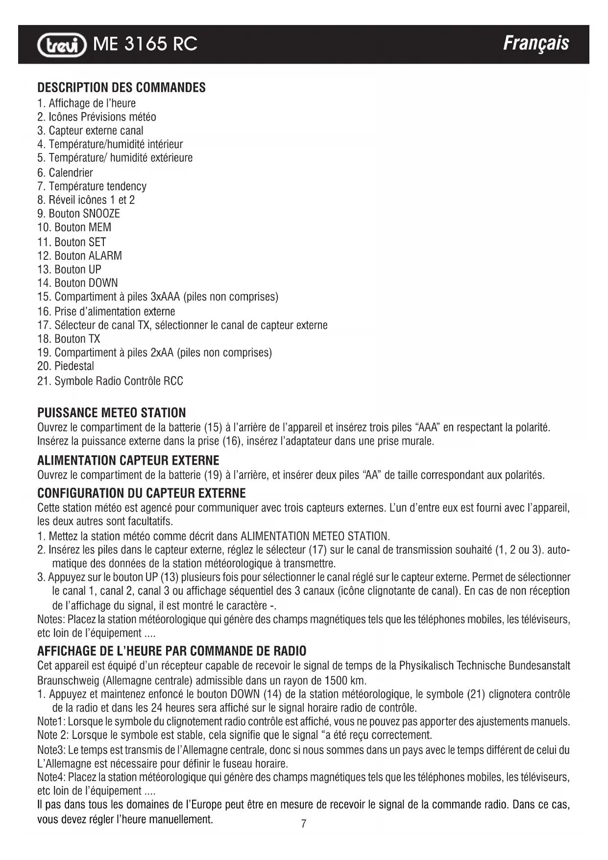 ME 3165 RC - Station Météo Trevi - Notice d'utilisation et mode d'emploi gratuit