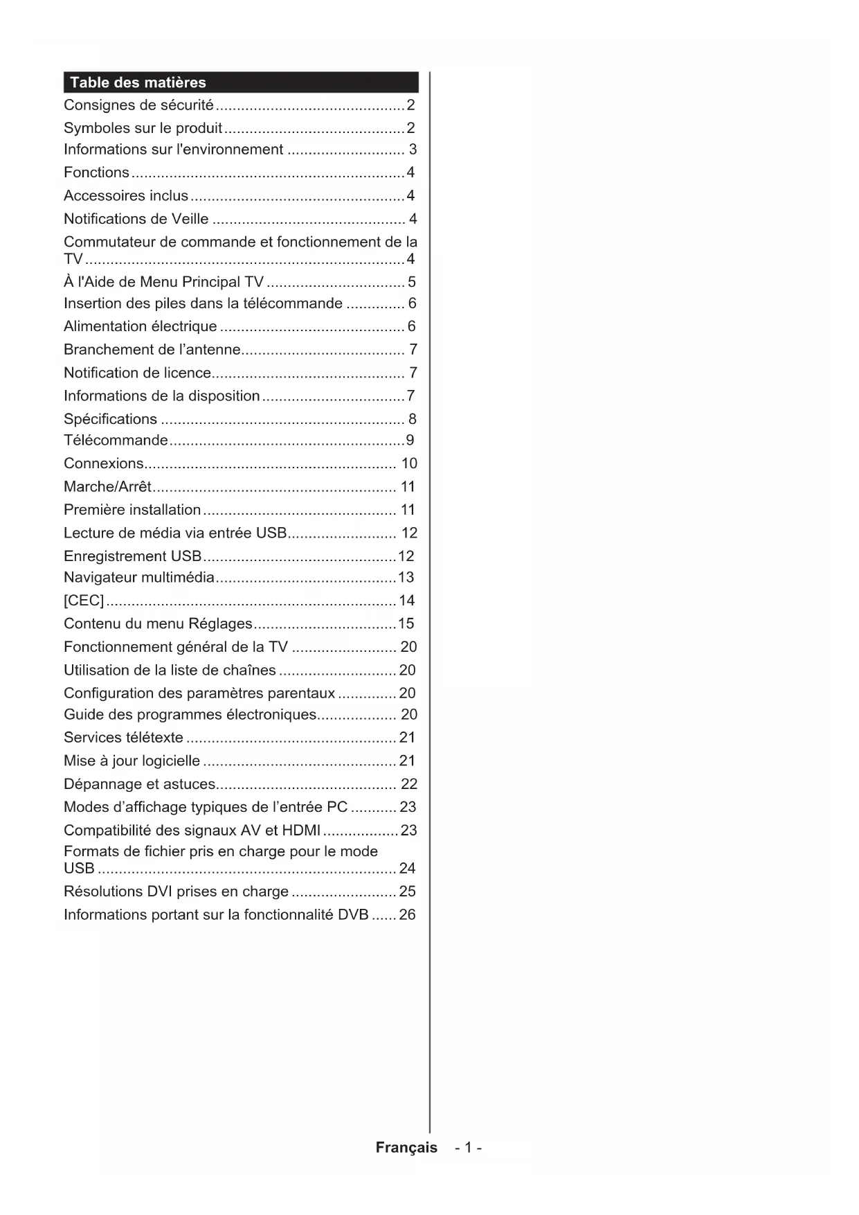 Tous les fichiers de la liste seront lus en boucle suivant le même ordre aléatoire. Pour utiliser les fonctions de la barre d'information, mettez en évidence le symbole de la fonction et appuyez sur OK. Pour modifier l'état d'une fonction, mettez en surbrillance le symbole de la fonction et appuyez sur OK autant de fois que nécessaire. Si le symbole est marqué d'une croix rouge, cela signifie qu'il est désactivé.Français - 14 - [CEC] Cette fonction permet de contrôler les périphériques actifs CEC qui sont connectés aux ports HDMI à partir de la télécommande de la Télé. L'option CEC du menu Réglages>Système>Plus doit être définie sur Activé en premier lieu. Appuyez sur le bouton Source et sélectionnez l’entrée HDMI du périphérique CEC connecté à partir du menu Liste de Sources. Si un nouveau périphérique source CEC est connecté, il s’affiche dans le menu Source avec son propre nom, au lieu du nom des ports HDMI connectés (lecteur DVD, enregistreur 1, etc.) La télécommande de la télé peut automatiquement fonctionner après avoir sélectionné la source HDMI connectée. Pour mettre fin à cette opération et contrôler à nouveau le téléviseur à partir de la télécommande, appuyez et maintenez enfoncé le bouton « 0-Zero » de la télécommande pendant 3 secondes. Vous pouvez désactiver la fonctionnalité CEC en réglant l'option correspondante dans le menu Réglages>Système>Plus. Le téléviseur prend en charge la technologie ARC (Audio Return Channel). Cette fonction est un lien audio qui permet de remplacer d’autres câbles entre le téléviseur et un système audio (récepteur A/V ou système stéréo). Une fois la fonction activée, le téléviseur ne mute pas automatiquement les autres sorties audio. Vous devrez réduire manuellement le volume du téléviseur à zéro si vous souhaitez écouter uniquement le son ARC (pareil pour les sorties audio numériques optiques ou coaxiales). Si vous souhaitez modifier le volume du périphérique connecté, sélectionnez le périphérique à partir de la liste des sources. Dans ce cas, les touches de contrôle du volume s'orientent vers le périphérique audio connecté. Lors de l'utilisation de la connexion ARC, certaines incompatibilités peuvent se produire entre le téléviseur et le système sonore connecté en raison de la différence des gammes de volume utilisées. Remarque : La souris ARC fonctionne uniquement via l'entrée HDMI1. Commande audio système Permet d'utiliser l'option Amplificateur/récepteur audio avec le téléviseur. Vous pouvez régler le volume à l'aide de la télécommande de votre téléviseur. Pour activer cette fonction, définissez l'option Haut- parleurs du menu Réglages>Système>Plus sur Amplificateur. Les haut-parleurs du téléviseur seront coupés et le son de la source visionnée proviendra du système audio connecté. Remarque : L’appareil audio devrait prendre en charge la fonction de Contrôle du Système Audio et l’option CEC doit être réglée sur Activé.Français - 15 - Contenu du menu Réglages Contenu du menu Image Mode Vous pouvez modifiez le mode d'image selon vos préférences ou exigences. Le mode Image peut être réglé sur l’une de ces options : Cinéma, Jeux (en option), Sport, Dynamique et Naturel. Contraste Règle les valeurs de l’éclairage et de l’obscurité de l'écran. Luminosité Règle la valeur de luminosité de l’écran. Netteté Définit la valeur de netteté des objets affichés à l’écran. Couleur Règle la valeur de la couleur et les couleurs. Économie d’énergie Cette fonction permet de régler le mode Économie d’énergie sur les options Personnalisation, Minimum, Moyen, Maximum, Automatique, Extinction d'écran ou Désactivé. Remarque: Les options disponibles peuvent varier en fonction du Mode sélectionné. Rétro éclairage Ce paramètre contrôle le niveau du rétroéclairage. La fonction de rétroéclairage sera inactive si le Mode Économie d’énergie est réglé sur une option autre que Personnalisation. Paramètres avancés Contraste dynamique Vous pouvez régler le rapport de contraste dynamique à votre guise. Réduction du bruit Si le signal de diffusion est faible et l’image est bruyante, utilisez la fonction Réduction du bruit pour réduire l’intensité du bruit. Température de couleur Règle la valeur de la température de couleur désirée. Les options Froid, Normal, Chaud et Personnalisé sont disponibles. Point blanc Si l'option Couleur de température est définie sur Personnalisé, ce réglage sera possible. Augmentez la « chaleur » ou la « fraîcheur » de l'image en appuyant sur les boutons Gauche ou Droit. Zoom image Règle le format et la taille de l'image souhaités. Changement d'Image Cette option peut être disponible en fonction du réglage du Zoom de l'Image. Mettez en surbrillance et appuyez sur OK, puis utilisez les boutons directionnels pour déplacer l'image vers le haut ou vers le bas. Mode Film Les films sont enregistrés à un nombre d’images par seconde différent des programmes de télévision normaux. Activez cette fonction lorsque vous regardez des films afin de mieux visualiser les images accélérées. Ton de Chair La fonction Carnation peut être modifiée entre -5 et 5. Changer de couleur Réglez le ton de la couleur désirée. HDMI Large bande Lorsque vous regardez le téléviseur à partir d'une source HDMI, la fonction HDMI Large bande est visible. Vous pouvez utiliser cette option pour renforcer la noirceur de l’image. Position du PC S’affiche uniquement lorsque la source d’entrée est définie sur VGA/PC. Position automatique Si l'image n'est pas centrée en mode VGA, utilisez cette option pour ajuster automatiquement la position de l'image. Appuyez sur OK pour lancer le réglage automatique. Position H Cette option déplace l’image horizontalement vers le côté droit ou gauche de l’écran. Position V Cette option déplace l’image