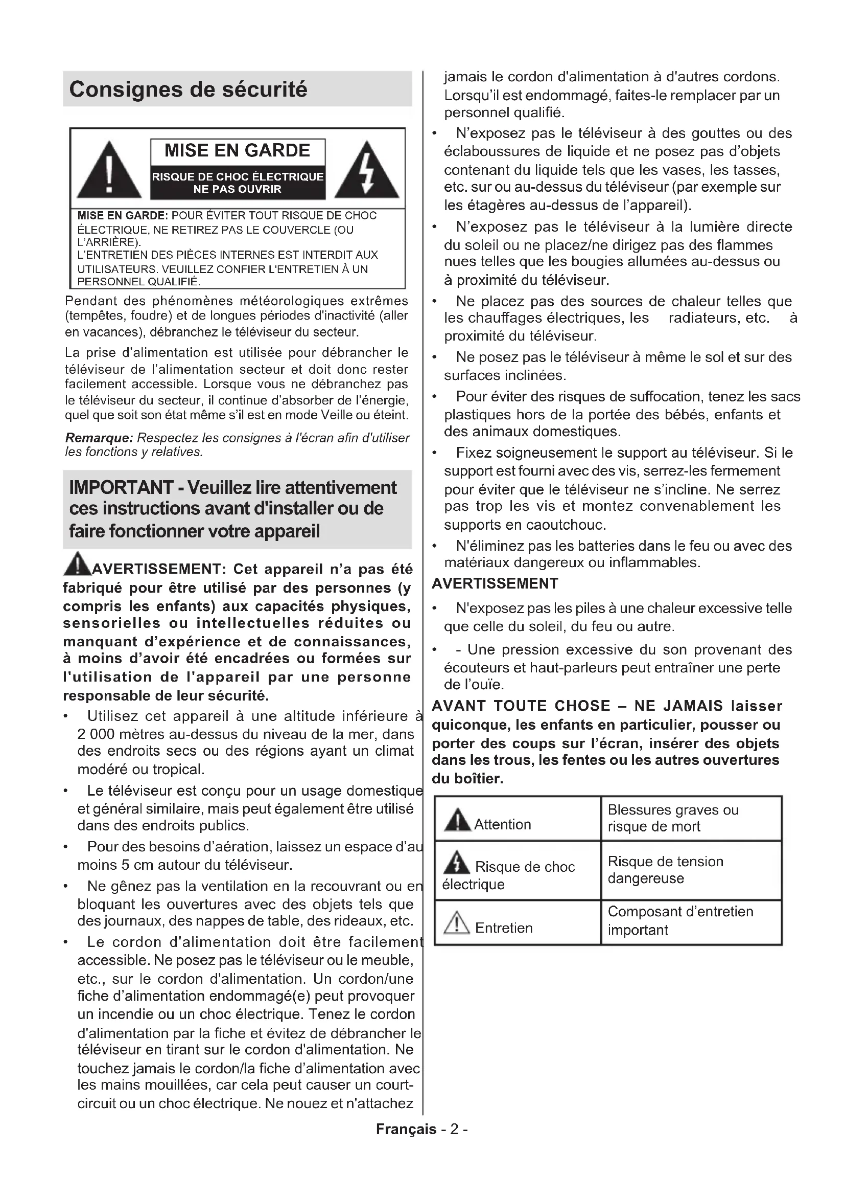 RISQUE DE CHOC ÉLECTRIQUENE PAS OUVRIRMISE EN GARDE: POUR ÉVITER TOUT RISQUE DE CHOC ÉLECTRIQUE, NE RETIREZ PAS LE COUVERCLE (OU L’ARRIÈRE). L’ENTRETIEN DES PIÈCES INTERNES EST INTERDIT AUX UTILISATEURS. VEUILLEZ CONFIER L'ENTRETIEN À UN PERSONNEL QUALIFIÉ.Remarque: Respectez les consignes à l'écran an d'utiliser les fonctions y relatives.Pendant des phénomènes météorologiques extrêmes (tempêtes, foudre) et de longues périodes d'inactivité (aller en vacances), débranchez le téléviseur du secteur.La prise d’alimentation est utilisée pour débrancher le téléviseur de l’alimentation secteur et doit donc rester facilement accessible. Lorsque vous ne débranchez pas le téléviseur du secteur, il continue d’absorber de l’énergie, quel que soit son état même s’il est en mode Veille ou éteint. IMPORTANT - Veuillez lire attentivement ces instructions avant d'installer ou de faire fonctionner votre appareil