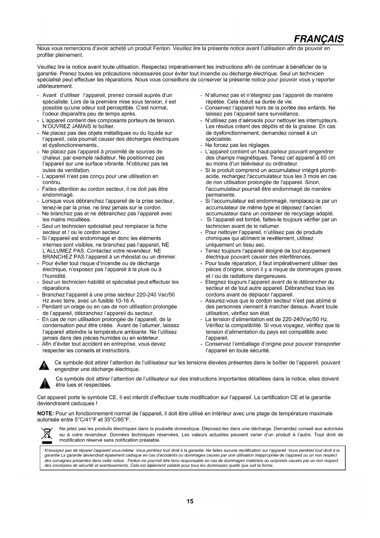 Antes de conectar el cable de alimentación, compruebe si la red eléctrica corresponde a la tensión indicada en la placa de características de la unidad.15 FRANÇAIS Nous vous remercions d’avoir acheté un produit Fenton. Veuillez lire la présente notice avant l’utilisation afin de pouvoir en profiter pleinement. Veuillez lire la notice avant toute utilisation. Respectez impérativement les instructions afin de continuer à bénéficier de la garantie. Prenez toutes les précautions nécessaires pour éviter tout incendie ou décharge électrique. Seul un technicien spécialisé peut effectuer les réparations. Nous vous conseillons de conserver la présente notice pour pouvoir vous y reporter ultérieurement. - Avant d’utiliser l’appareil, prenez conseil auprès d’un spécialiste. Lors de la première mise sous tension, il est possible qu’une odeur soit perceptible. C’est normal, l’odeur disparaîtra peu de temps après. - L’appareil contient des composants porteurs de tension. N’OUVREZ JAMAIS le boîtier. - Ne placez pas des objets métalliques ou du liquide sur l’appareil, cela pourrait causer des décharges électriques et dysfonctionnements.. - Ne placez pas l’appareil à proximité de sources de chaleur, par exemple radiateur. Ne positionnez pas l’appareil sur une surface vibrante. N’obturez pas les ouïes de ventilation. - L’appareil n’est pas conçu pour une utilisation en continu. - Faites attention au cordon secteur, il ne doit pas être endommagé. - Lorsque vous débranchez l’appareil de la prise secteur, tenez-le par la prise, ne tirez jamais sur le cordon. - Ne branchez pas et ne débranchez pas l’appareil avec les mains mouillées. - Seul un technicien spécialisé peut remplacer la fiche secteur et / ou le cordon secteur. - Si l’appareil est endommagé et donc les éléments internes sont visibles, ne branchez pas l’appareil, NE L’ALLUMEZ PAS. Contactez votre revendeur. NE BRANCHEZ PAS l’appareil à un rhéostat ou un dimmer. - Pour éviter tout risque d’incendie ou de décharge électrique, n’exposez pas l’appareil à la pluie ou à l’humidité. - Seul un technicien habilité et spécialisé peut effectuer les réparations - Branchez l’appareil à une prise secteur 220-240 Vac/50 Hz avec terre, avec un fusible 10-16 A. - Pendant un orage ou en cas de non utilisation prolongée de l’appareil, débranchez l’appareil du secteur. - En cas de non utilisation prolongée de l’appareil, de la condensation peut être créée. Avant de l’allumer, laissez l’appareil atteindre la température ambiante. Ne l’utilisez jamais dans des pièces humides ou en extérieur. - Afin d’éviter tout accident en entreprise, vous devez respecter les conseils et instructions. - N’allumez pas et n’éteignez pas l’appareil de manière répétée. Cela réduit sa durée de vie. - Conservez l’appareil hors de la portée des enfants. Ne laissez pas l’appareil sans surveillance. - N’utilisez pas d’aérosols pour nettoyer les interrupteurs. Les résidus créent des dépôts et de la graisse. En cas de dysfonctionnement, demandez conseil à un spécialiste. - Ne forcez pas les réglages. - L’appareil contient un haut-parleur pouvant engendrer des champs magnétiques. Tenez cet appareil à 60 cm au moins d’un téléviseur ou ordinateur. - Si le produit comprend un accumulateur intégré plomb- acide, rechargez l'accumulateur tous les 3 mois en cas de non utilisation prolongée de l'appareil. Sinon, l'accumulateur pourrait être endommagé de manière permanente. - Si l’accumulateur est endommagé, remplacez-le par un accumulateur de même type et déposez l’ancien accumulateur dans un container de recyclage adapté. - Si l’appareil est tombé, faites-le toujours vérifier par un technicien avant de le rallumer. - Pour nettoyer l’appareil, n’utilisez pas de produits chimiques qui abîment le revêtement, utilisez uniquement un tissu sec. - Tenez toujours l’appareil éloigné de tout équipement électrique pouvant causer des interférences. - Pour toute réparation, il faut impérativement utiliser des pièces d’origine, sinon il y a risque de dommages graves et / ou de radiations dangereuses. - Eteignez toujours l’appareil avant de le débrancher du secteur et de tout autre appareil. Débranchez tous les cordons avant de déplacer l’appareil. - Assurez-vous que le cordon secteur n’est pas abîmé si des personnes viennent à marcher dessus. Avant toute utilisation, vérifiez son état. - La tension d’alimentation est de 220-240Vac/50 Hz. Vérifiez la compatibilité. Si vous voyagez, vérifiez que la tension d’alimentation du pays est compatible avec l’appareil. - Conservez l’emballage d’origine pour pouvoir transporter l’appareil en toute sécurité. Ce symbole doit attirer l’attention de l’utilisateur sur les tensions élevées présentes dans le boîtier de l’appareil, pouvant engendrer une décharge électrique. Ce symbole doit attirer l’attention de l’utilisateur sur des instructions importantes détaillées dans la notice, elles doivent être lues et respectées. Cet appareil porte le symbole CE. Il est interdit d’effectuer toute modification sur l’appareil. La certification CE et la garantie deviendraient caduques ! NOTE: Pour un fonctionnement normal de l’appareil, il doit être utilisé en intérieur avec une plage de température maximale autorisée entre 5°C/41°F et 35°C/95°F. Ne jetez pas les produits électriques dans la poubelle domestique. Déposez-les dans une décharge. Demandez conseil aux autorisés ou à votre revendeur. Données techniques réservées. Les valeurs actuelles peuvent varier d’un produit à l’autre. Tout droit de modification réservé sans notification préalable.