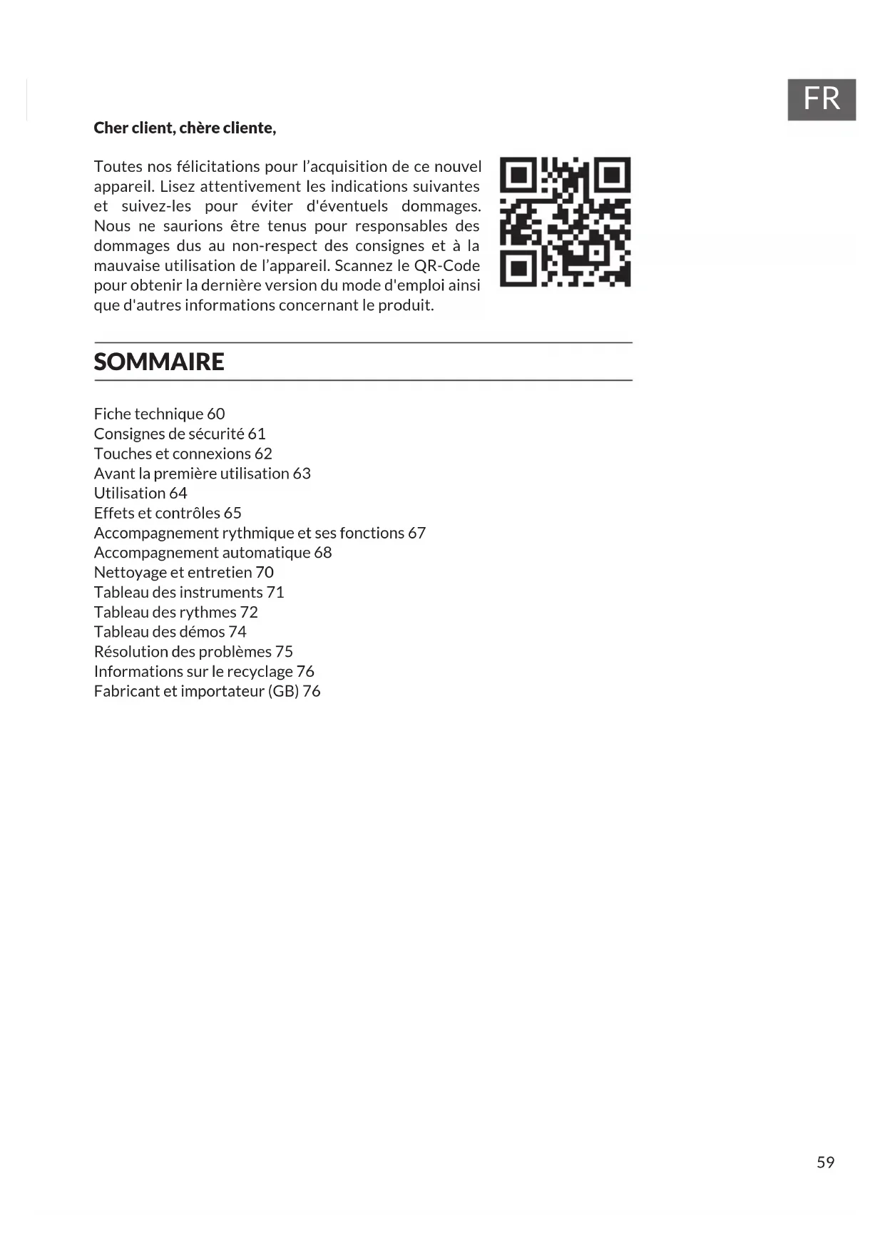 Cher client, chère cliente, Toutes nos félicitations pour l’acquisition de ce nouvel appareil. Lisez attentivement les indications suivantes et suivez-les pour éviter d'éventuels dommages. Nous ne saurions être tenus pour responsables des dommages dus au non-respect des consignes et à la mauvaise utilisation de l’appareil. Scannez le QR-Code pour obtenir la dernière version du mode d'emploi ainsi que d'autres informations concernant le produit. SOMMAIRE Fiche technique 60 Consignes de sécurité 61 Touches et connexions 62 Avant la première utilisation 63 Utilisation 64 Effets et contrôles 65 Accompagnement rythmique et ses fonctions 67 Accompagnement automatique 68 Nettoyage et entretien 70 Tableau des instruments 71 Tableau des rythmes 72 Tableau des démos 74 Résolution des problèmes 75 Informations sur le recyclage 76 Fabricant et importateur (GB) 7660