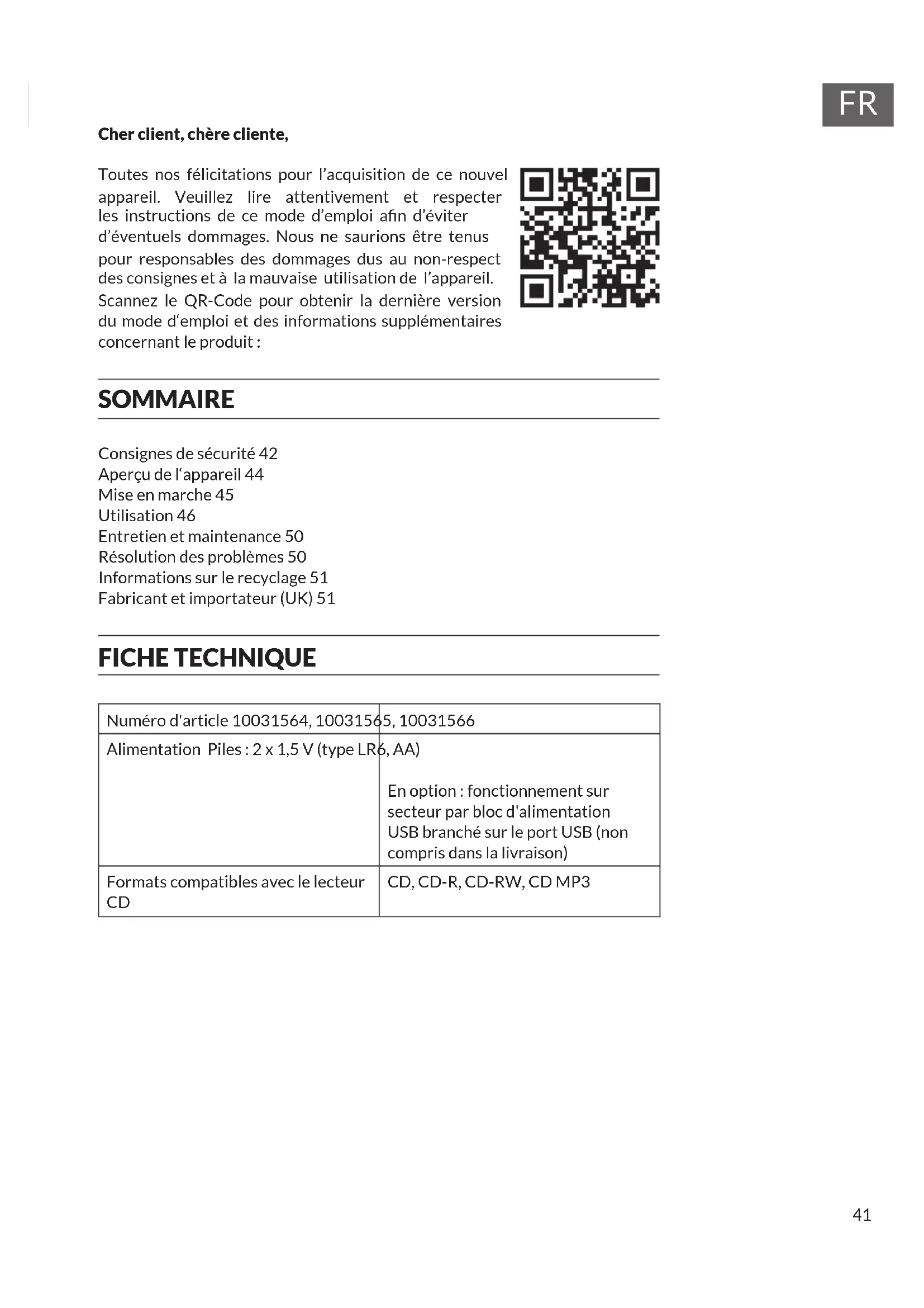 Cher client, chère cliente, Toutes nos félicitations pour l’acquisition de ce nouvel appareil. Veuillez lire attentivement et respecter les instructions de ce mode d’emploi an d’éviter d’éventuels dommages. Nous ne saurions être tenus pour responsables des dommages dus au non-respect des consignes et à la mauvaise utilisation de l’appareil. Scannez le QR-Code pour obtenir la dernière version du mode d‘emploi et des informations supplémentaires concernant le produit : SOMMAIRE Consignes de sécurité 42 Aperçu de l‘appareil 44 Mise en marche 45 Utilisation 46 Entretien et maintenance 50 Résolution des problèmes 50 Informations sur le recyclage 51 Fabricant et importateur (UK) 51 FICHE TECHNIQUE Numéro d'article 10031564, 10031565, 10031566 Alimentation Piles : 2 x 1,5 V (type LR6, AA) En option : fonctionnement sur secteur par bloc d'alimentation USB branché sur le port USB (non compris dans la livraison) Formats compatibles avec le lecteur