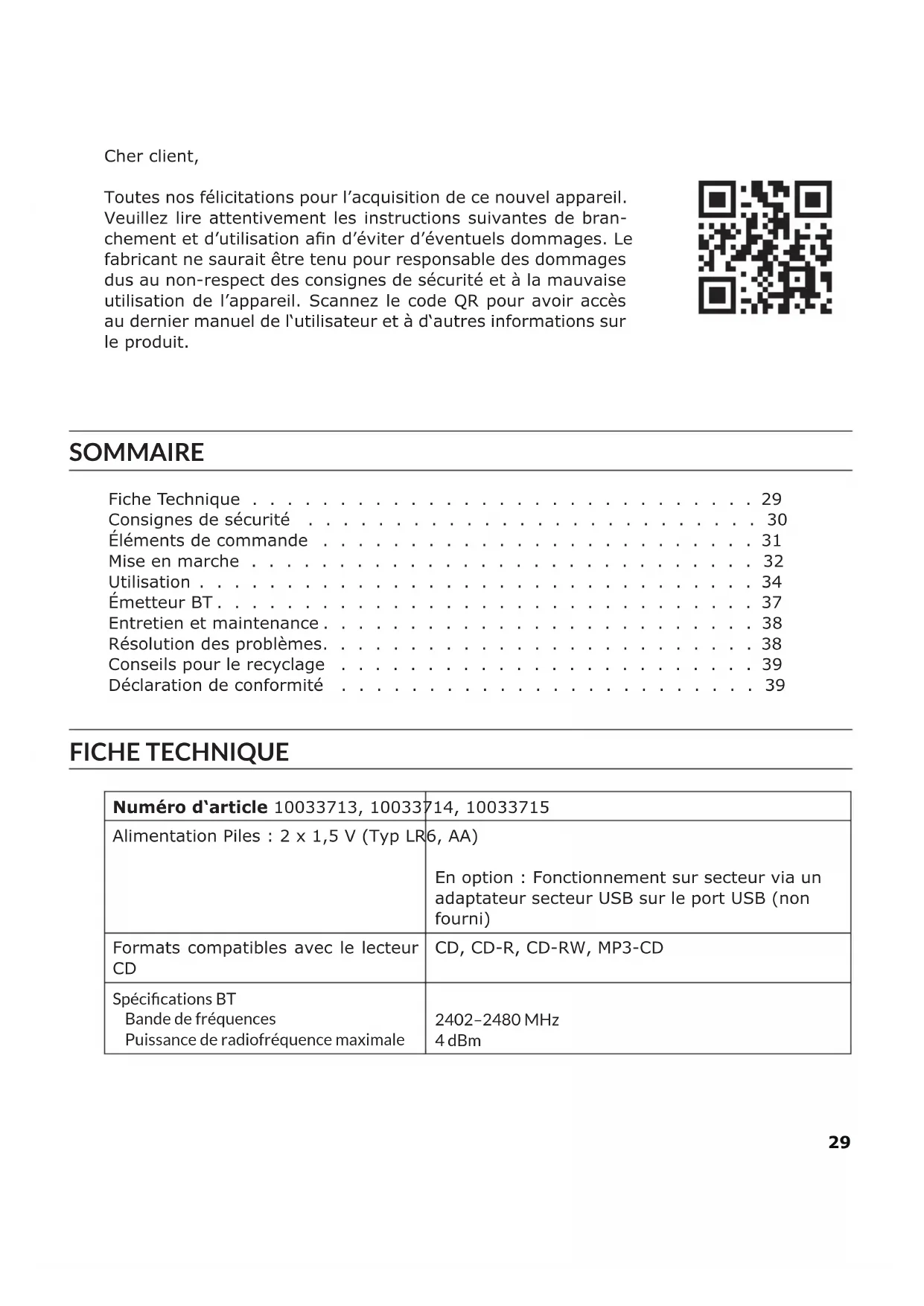 - Déclaration de conformité FICHE TECHNIQUE Numéro d‘article 10033713, 10033714, 10033715 Alimentation Piles : 2 x 1,5 V (Typ LR6, AA) En option : Fonctionnement sur secteur via un adaptateur secteur USB sur le port USB (non fourni) Formats compatibles avec le lecteur p. 39