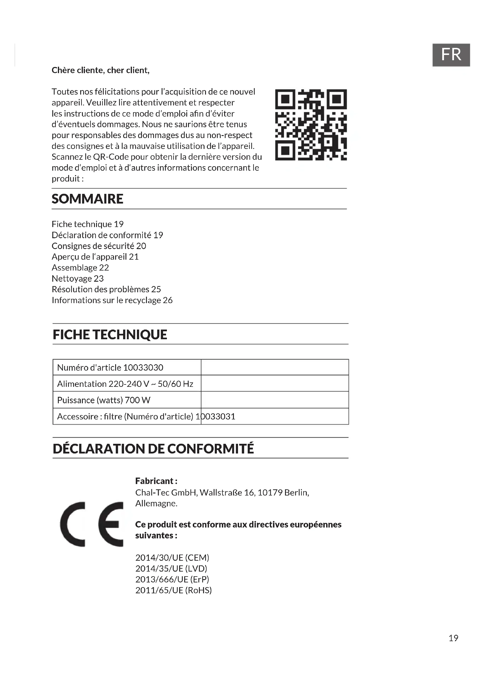 Fabricant : Chal-Tec GmbH, Wallstraße 16, 10179 Berlin, Allemagne. Ce produit est conforme aux directives européennes suivantes : 2014/30/UE (CEM) 2014/35/UE (LVD) 2013/666/UE (ErP) 2011/65/UE (RoHS)20