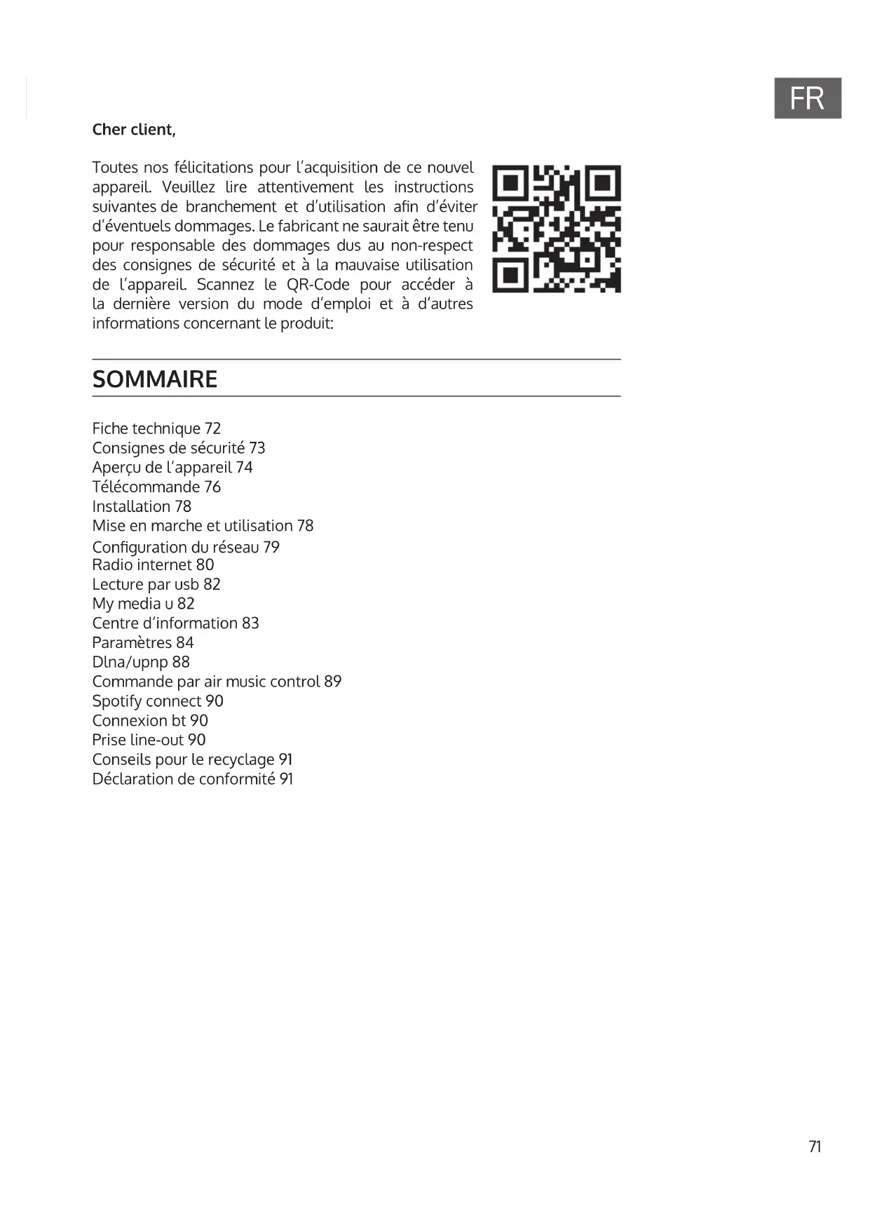 Cher client, Toutes nos félicitations pour l’acquisition de ce nouvel appareil. Veuillez lire attentivement les instructions suivantes de branchement et d’utilisation an d’éviter d’éventuels dommages. Le fabricant ne saurait être tenu pour responsable des dommages dus au non-respect des consignes de sécurité et à la mauvaise utilisation de l’appareil. Scannez le QR-Code pour accéder à la dernière version du mode d‘emploi et à d‘autres informations concernant le produit: SOMMAIRE Fiche technique 72 Consignes de sécurité 73 Aperçu de l‘appareil 74 Télécommande 76 Installation 78 Mise en marche et utilisation 78 Conguration du réseau 79 Radio internet 80 Lecture par usb 82 My media u 82 Centre d‘information 83 Paramètres 84 Dlna/upnp 88 Commande par air music control 89 Spotify connect 90 Connexion bt 90 Prise line-out 90 Conseils pour le recyclage 91 Déclaration de conformité 9172