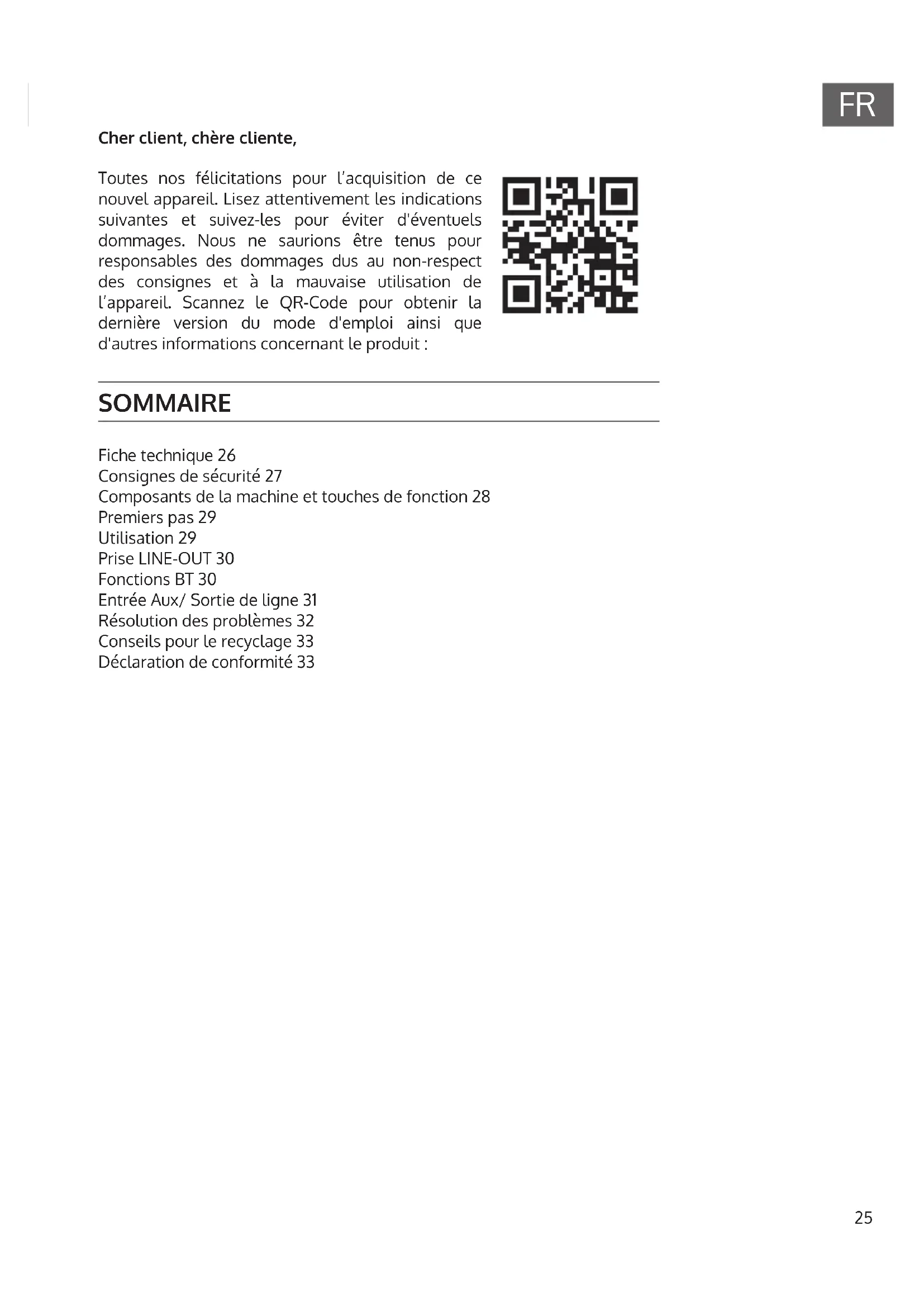 Cher client, chère cliente, Toutes nos félicitations pour l’acquisition de ce nouvel appareil. Lisez attentivement les indications suivantes et suivez-les pour éviter d'éventuels dommages. Nous ne saurions être tenus pour responsables des dommages dus au non-respect des consignes et à la mauvaise utilisation de l’appareil. Scannez le QR-Code pour obtenir la dernière version du mode d'emploi ainsi que d'autres informations concernant le produit : SOMMAIRE Fiche technique 26 Consignes de sécurité 27 Composants de la machine et touches de fonction 28 Premiers pas 29 Utilisation 29 Prise LINE-OUT 30 Fonctions BT 30 Entrée Aux/ Sortie de ligne 31 Résolution des problèmes 32 Conseils pour le recyclage 33 Déclaration de conformité 3326