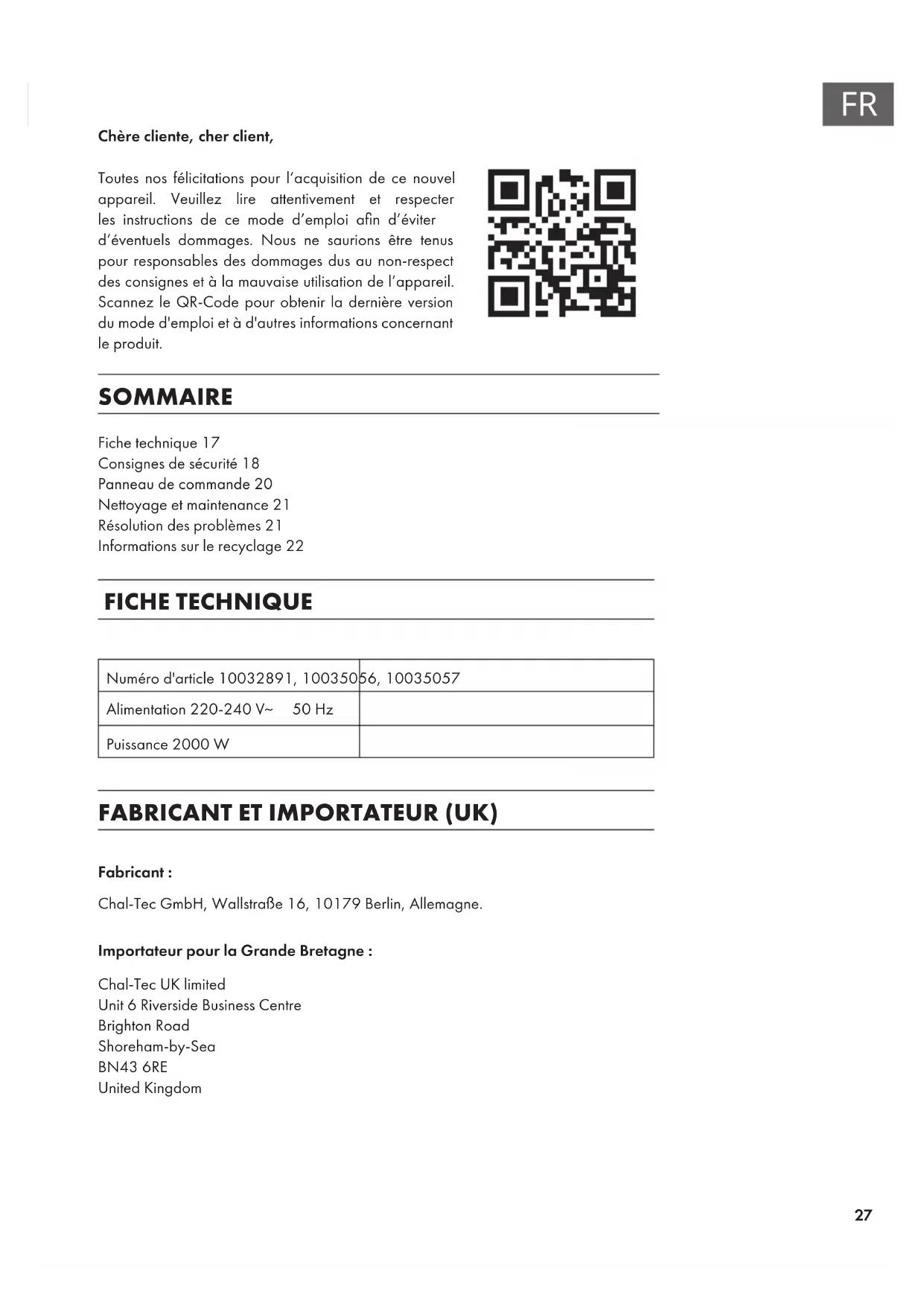 Fiche technique 17 Consignes de sécurité 18 Panneau de commande 20 Nettoyage et maintenance 21 Résolution des problèmes 21 Informations sur le recyclage 22 FICHE TECHNIQUE Numéro d'article 10032891, 10035056, 10035057 Alimentation 220-240 V~ 50 Hz Puissance 2000 W FABRICANT ET IMPORTATEUR (UK) Fabricant : Chal-Tec GmbH, Wallstraße 16, 10179 Berlin, Allemagne. Importateur pour la Grande Bretagne : Chal-Tec UK limited Unit 6 Riverside Business Centre Brighton Road Shoreham-by-Sea BN43 6RE United Kingdom Chère cliente, cher client, Toutes nos félicitations pour l’acquisition de ce nouvel appareil. Veuillez lire attentivement et respecter les instructions de ce mode d’emploi an d’éviter d’éventuels dommages. Nous ne saurions être tenus pour responsables des dommages dus au non-respect des consignes et à la mauvaise utilisation de l’appareil. Scannez le QR-Code pour obtenir la dernière version du mode d'emploi et à d'autres informations concernant le produit. SOMMAIRE28
