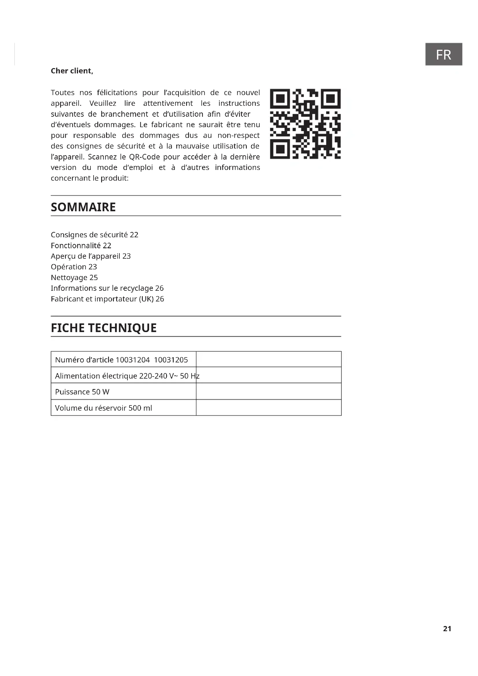 Cher client, Toutes nos félicitations pour l’acquisition de ce nouvel appareil. Veuillez lire attentivement les instructions suivantes de branchement et d’utilisation an d’éviter d’éventuels dommages. Le fabricant ne saurait être tenu pour responsable des dommages dus au non-respect des consignes de sécurité et à la mauvaise utilisation de l’appareil. Scannez le QR-Code pour accéder à la dernière version du mode d‘emploi et à d‘autres informations concernant le produit: SOMMAIRE Consignes de sécurité 22 Fonctionnalité 22 Aperçu de l’appareil 23 Opération 23 Nettoyage 25 Informations sur le recyclage 26 Fabricant et importateur (UK) 26 FICHE TECHNIQUE Numéro d’article 10031204 10031205 Alimentation électrique 220-240 V~ 50 Hz Puissance 50 W Volume du réservoir 500 ml22