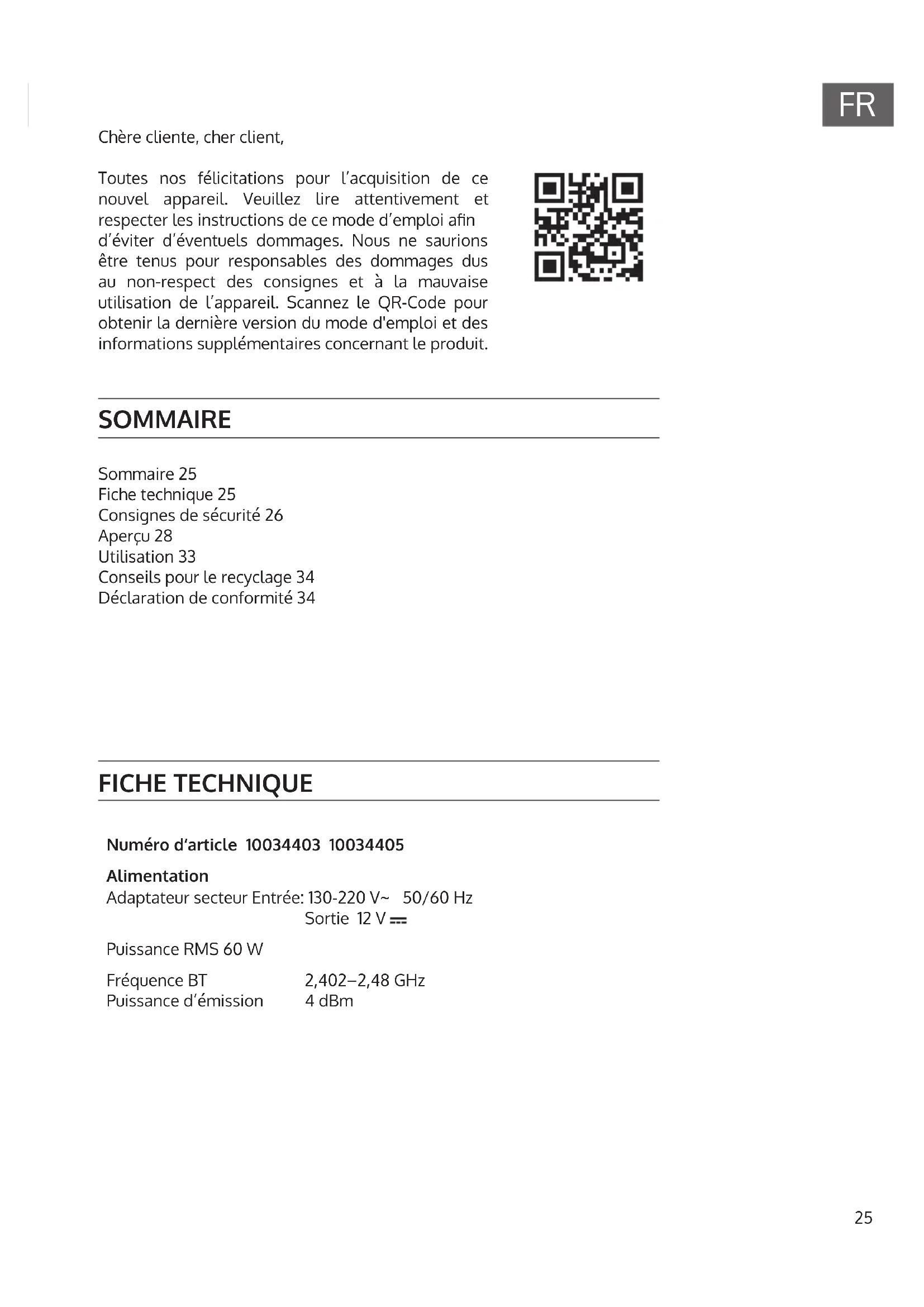 Chère cliente, cher client, Toutes nos félicitations pour l’acquisition de ce nouvel appareil. Veuillez lire attentivement et respecter les instructions de ce mode d’emploi an d’éviter d’éventuels dommages. Nous ne saurions être tenus pour responsables des dommages dus au non-respect des consignes et à la mauvaise utilisation de l’appareil. Scannez le QR-Code pour obtenir la dernière version du mode d'emploi et des informations supplémentaires concernant le produit. FICHE TECHNIQUE Numéro d‘article 10034403 10034405 Alimentation Adaptateur secteur Entrée: 130-220 V~ 50/60 Hz Sortie 12 V Puissance RMS 60 W Fréquence BT Puissance d‘émission 2,402–2,48 GHz 4 dBm SOMMAIRE Sommaire 25 Fiche technique 25 Consignes de sécurité 26 Aperçu 28 Utilisation 33 Conseils pour le recyclage 34 Déclaration de conformité 3426