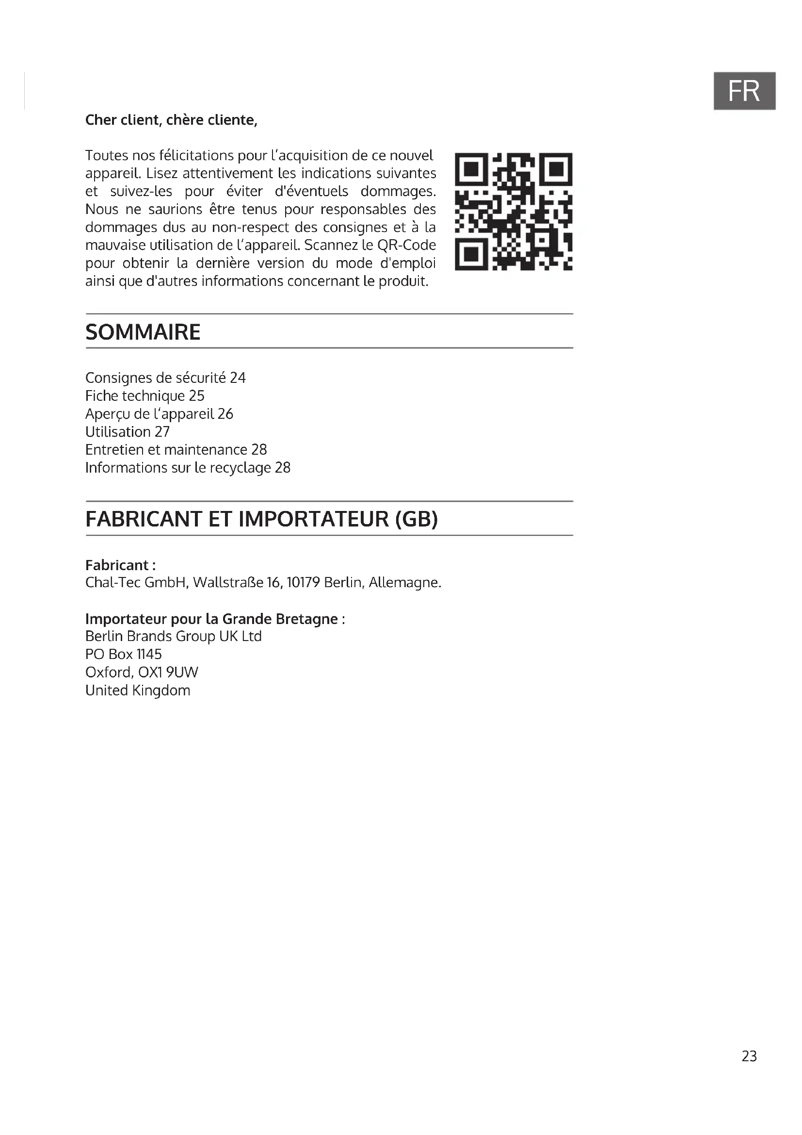 Cher client, chère cliente, Toutes nos félicitations pour l’acquisition de ce nouvel appareil. Lisez attentivement les indications suivantes et suivez-les pour éviter d'éventuels dommages. Nous ne saurions être tenus pour responsables des dommages dus au non-respect des consignes et à la mauvaise utilisation de l’appareil. Scannez le QR-Code pour obtenir la dernière version du mode d'emploi ainsi que d'autres informations concernant le produit. SOMMAIRE Consignes de sécurité 24 Fiche technique 25 Aperçu de l‘appareil 26 Utilisation 27 Entretien et maintenance 28 Informations sur le recyclage 28 FABRICANT ET IMPORTATEUR (GB) Fabricant : Chal-Tec GmbH, Wallstraße 16, 10179 Berlin, Allemagne. Importateur pour la Grande Bretagne : Berlin Brands Group UK Ltd PO Box 1145 Oxford, OX1 9UW United Kingdom24