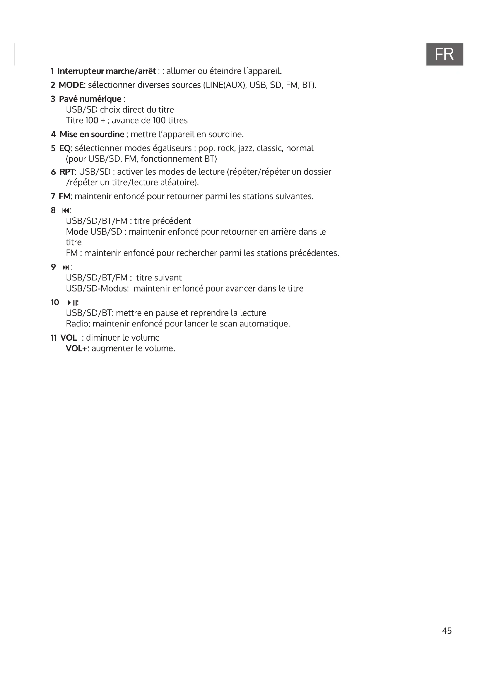1 Interrupteur marche/arrêt : : allumer ou éteindre l’appareil. 2 MODE: sélectionner diverses sources (LINE(AUX), USB, SD, FM, BT). 3 Pavé numérique : USB/SD choix direct du titre Titre 100 + : avance de 100 titres 4 Mise en sourdine : mettre l’appareil en sourdine. 5 EQ: sélectionner modes égaliseurs : pop, rock, jazz, classic, normal (pour USB/SD, FM, fonctionnement BT) 6 RPT: USB/SD : activer les modes de lecture (répéter/répéter un dossier /répéter un titre/lecture aléatoire). 7 FM: maintenir enfoncé pour retourner parmi les stations suivantes. 8 : USB/SD/BT/FM : titre précédent Mode USB/SD : maintenir enfoncé pour retourner en arrière dans le titre FM : maintenir enfoncé pour rechercher parmi les stations précédentes. 9 : USB/SD/BT/FM : titre suivant USB/SD-Modus: maintenir enfoncé pour avancer dans le titre 10 : USB/SD/BT: mettre en pause et reprendre la lecture Radio: maintenir enfoncé pour lancer le scan automatique. 11 VOL -: diminuer le volume VOL+: augmenter le volume.46
