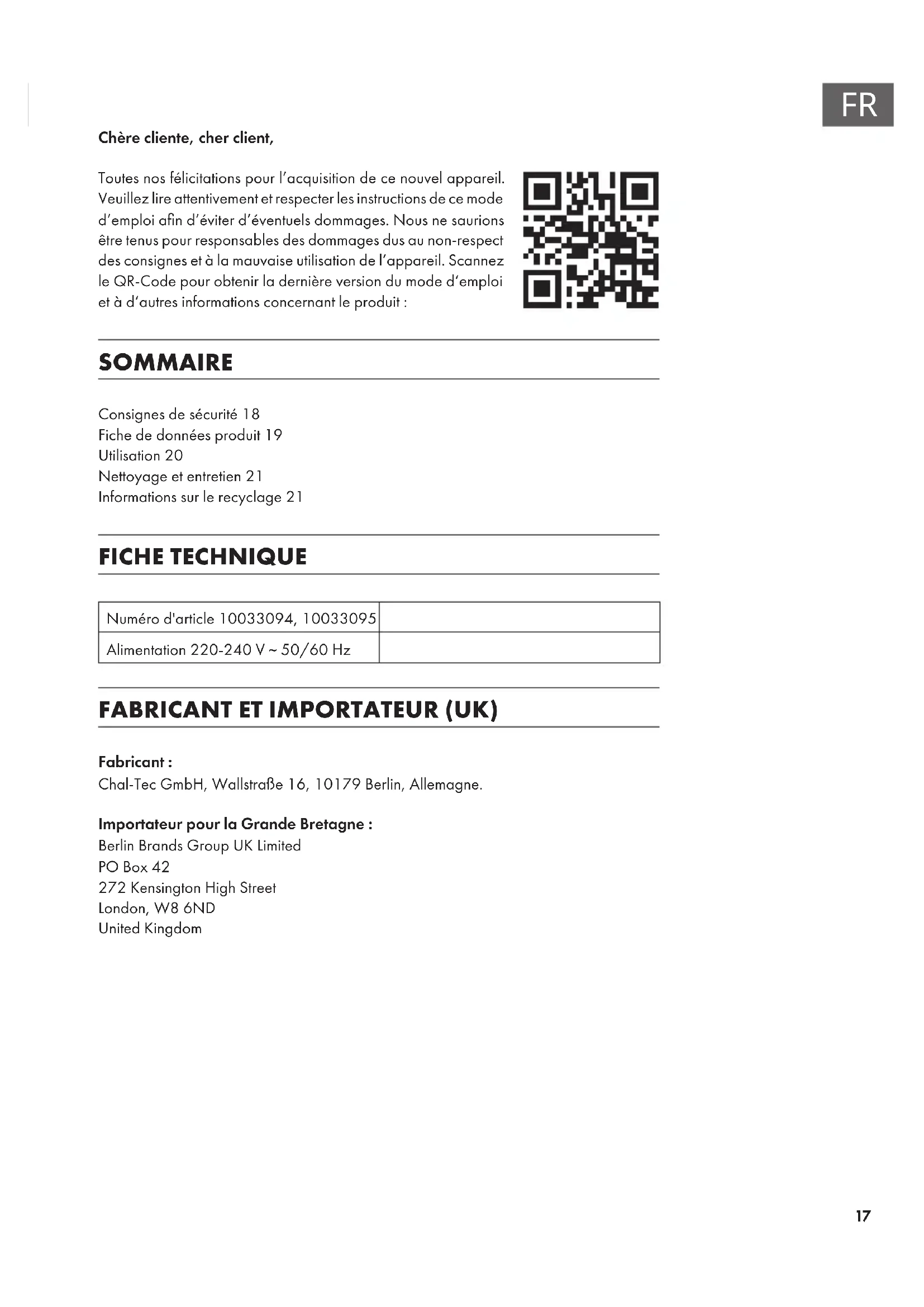 Chère cliente, cher client, Toutes nos félicitations pour l’acquisition de ce nouvel appareil. Veuillez lire attentivement et respecter les instructions de ce mode d’emploi an d’éviter d’éventuels dommages. Nous ne saurions être tenus pour responsables des dommages dus au non-respect des consignes et à la mauvaise utilisation de l’appareil. Scannez le QR-Code pour obtenir la dernière version du mode d‘emploi et à d‘autres informations concernant le produit : SOMMAIRE Consignes de sécurité18 Fiche de données produit19 Utilisation20 Nettoyage et entretien21 Informations sur le recyclage21 FICHE TECHNIQUE Numéro d'article 10033094, 10033095 Alimentation 220-240 V ~ 50/60 Hz FABRICANT ET IMPORTATEUR (UK) Fabricant : Chal-Tec GmbH, Wallstraße 16, 10179 Berlin, Allemagne. Importateur pour la Grande Bretagne : Berlin Brands Group UK Limited PO Box 42 272 Kensington High Street London, W8 6ND United Kingdom18