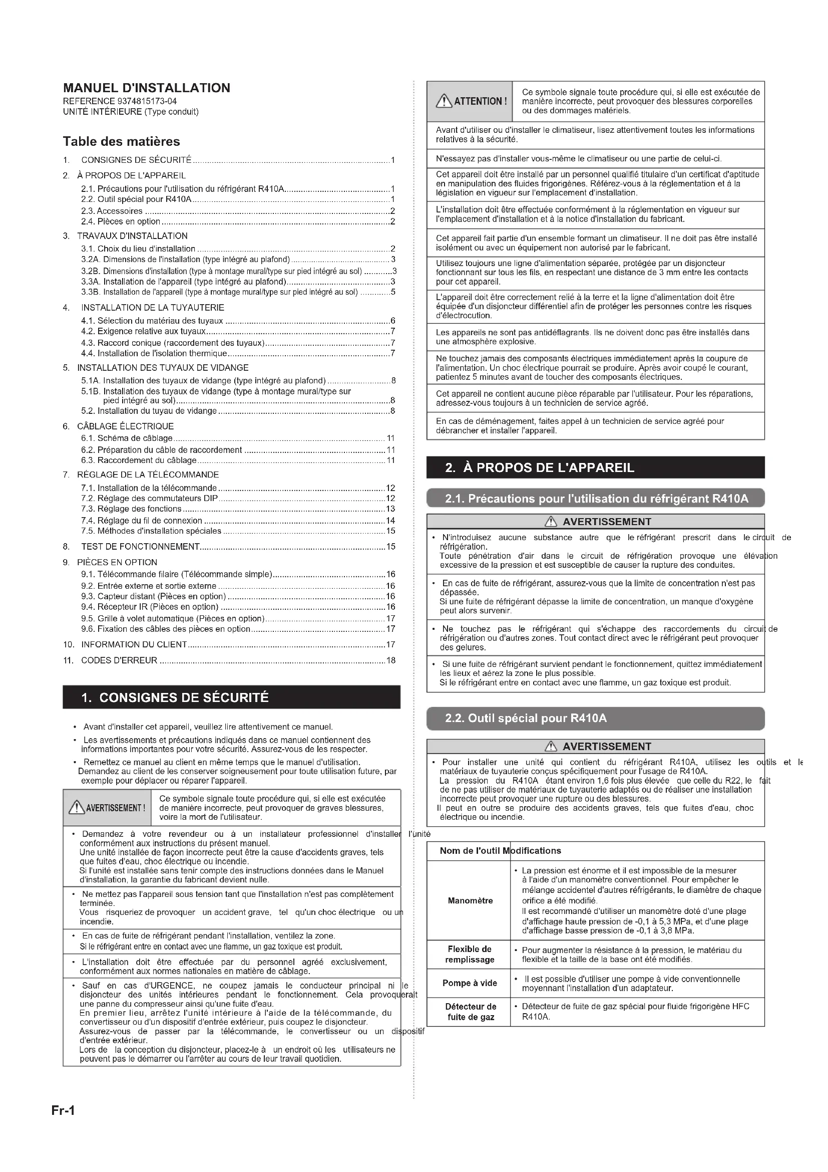9374815173-04_IM.indb 1 9/21/2011 1:45:04 PMFr-1 ATTENTION ! Cesymbolesignaletouteprocédurequi,sielleestexécutéedemanière incorrecte, peut provoquer des blessures corporelles oudesdommagesmatériels.Avant d'utiliser ou d'installer le climatiseur, lisez attentivement toutes les informations relativesàlasécurité.N'essayez pas d'installer vous-même le climatiseur ou une partie de celui-ci.Cetappareildoitêtreinstalléparunpersonnelqualifiétitulaired'uncertificatd'aptitudeenmanipulationdesfluidesfrigorigènes.Référez-vousàlaréglementationetàlalégislationenvigueursurl'emplacementd'installation.L'installationdoitêtreeffectuéeconformémentàlaréglementationenvigueur sur l'emplacement d'installation et à la notice d'installation du fabricant.Cetappareilfaitpartied'unensembleformantunclimatiseur.Ilnedoitpasêtreinstalléisolémentouavecunéquipementnonautoriséparlefabricant.Utiliseztoujoursuneligned'alimentationséparée,protégéeparundisjoncteurfonctionnant sur tous les fils, en respectant une distance de 3 mm entre les contacts pour cet appareil.L'appareildoitêtrecorrectementreliéàlaterreetlaligned'alimentationdoitêtreéquipéed'undisjoncteurdifférentielafindeprotégerlespersonnescontrelesrisquesd'électrocution.Lesappareilsnesontpasantidéflagrants.Ilsnedoiventdoncpasêtreinstallésdansune atmosphère explosive.Netouchezjamaisdescomposantsélectriquesimmédiatementaprèslacoupuredel'alimentation.Unchocélectriquepourraitseproduire.Aprèsavoircoupélecourant,patientez5minutesavantdetoucherdescomposantsélectriques.Cetappareilnecontientaucunepièceréparableparl'utilisateur.Pourlesréparations,adressez-voustoujoursàuntechniciendeserviceagréé.Encasdedéménagement,faitesappelàuntechniciendeserviceagréépourdébrancheretinstallerl'appareil.