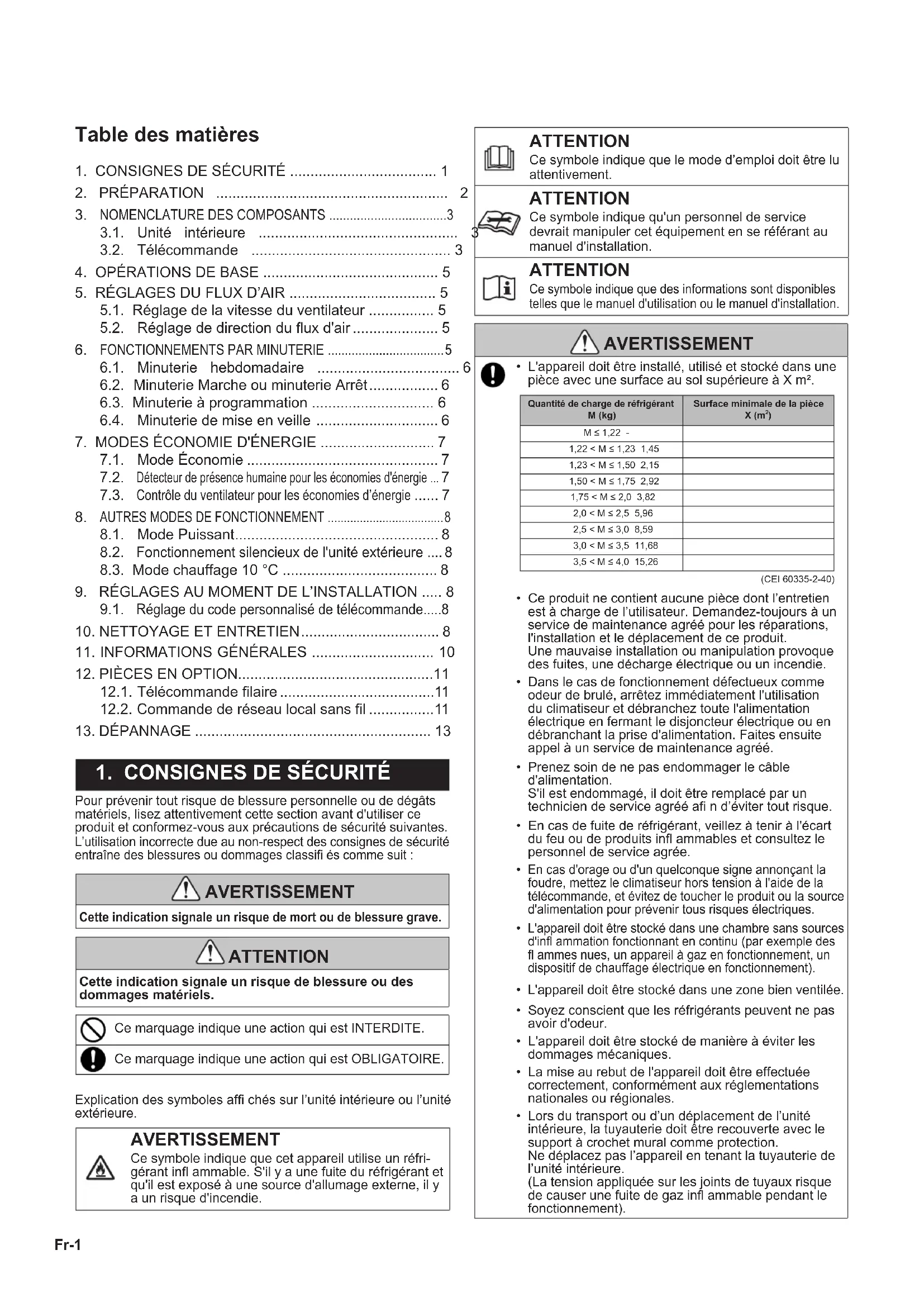 Pour prévenir tout risque de blessure personnelle ou de dégâts matériels, lisez attentivement cette section avant d'utiliser ce produit et conformez-vous aux précautions de sécurité suivantes. L’utilisation incorrecte due au non-respect des consignes de sécurité entraîne des blessures ou dommages classifi és comme suit : AVERTISSEMENT Cette indication signale un risque de mort ou de blessure grave. ATTENTION Cette indication signale un risque de blessure ou des dommages matériels. Ce marquage indique une action qui est INTERDITE. Ce marquage indique une action qui est OBLIGATOIRE. Explication des symboles affi chés sur l’unité intérieure ou l’unité extérieure. AVERTISSEMENT Ce symbole indique que cet appareil utilise un réfri- gérant infl ammable. S'il y a une fuite du réfrigérant et qu'il est exposé à une source d'allumage externe, il y a un risque d'incendie. ATTENTION Ce symbole indique que le mode d’emploi doit être lu attentivement. ATTENTION Ce symbole indique qu'un personnel de service devrait manipuler cet équipement en se référant au manuel d'installation. ATTENTION Ce symbole indique que des informations sont disponibles telles que le manuel d'utilisation ou le manuel d'installation. AVERTISSEMENT