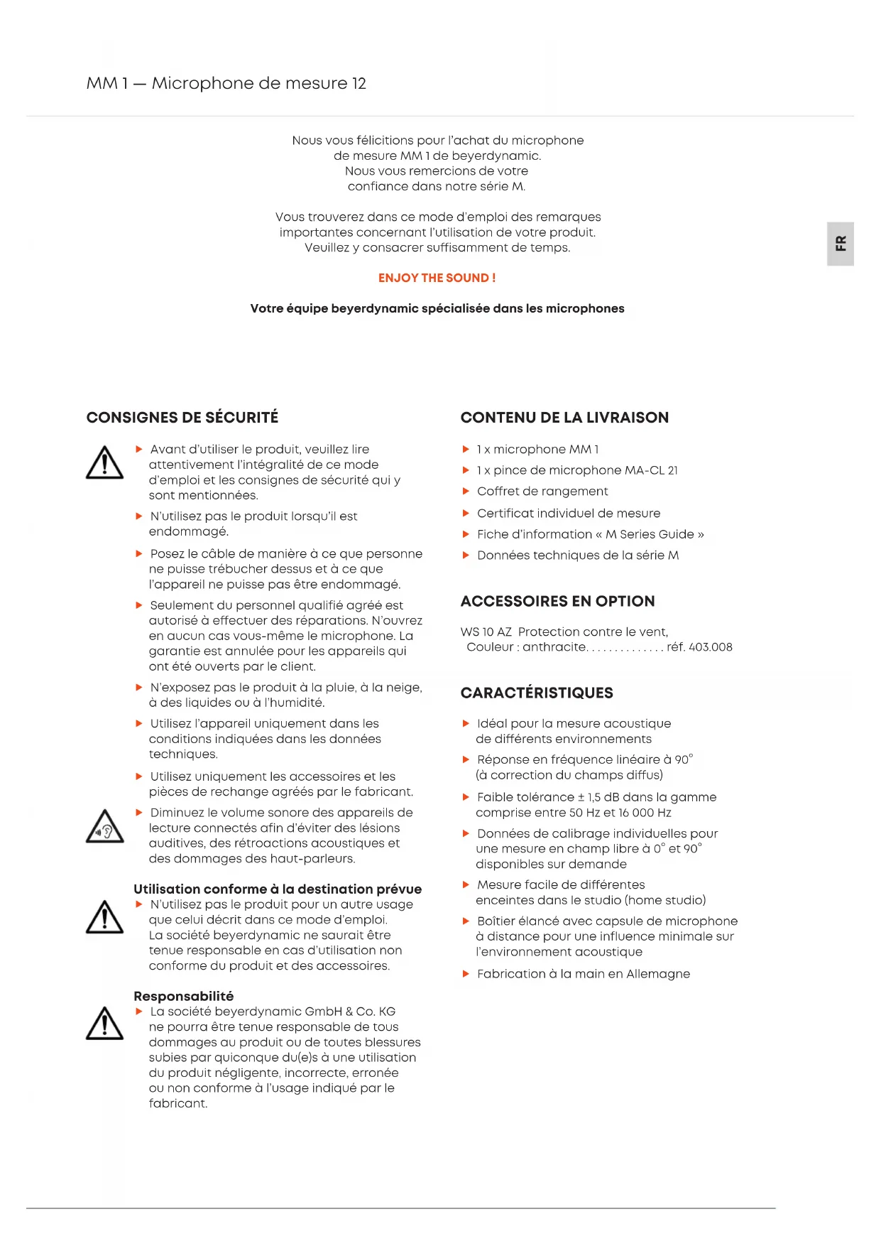 Nous vous félicitions pour l’achat du microphone de mesure MM 1 de beyerdynamic. Nous vous remercions de votre confiance dans notre série M. Vous trouverez dans ce mode d’emploi des remarques impoantes concernant l’utilisation de votre produit. Veuillez y consacrer suisamment de temps. ENJOY THE SOUND! Votre équipebeyerdynamic spécialisée dans les microphones