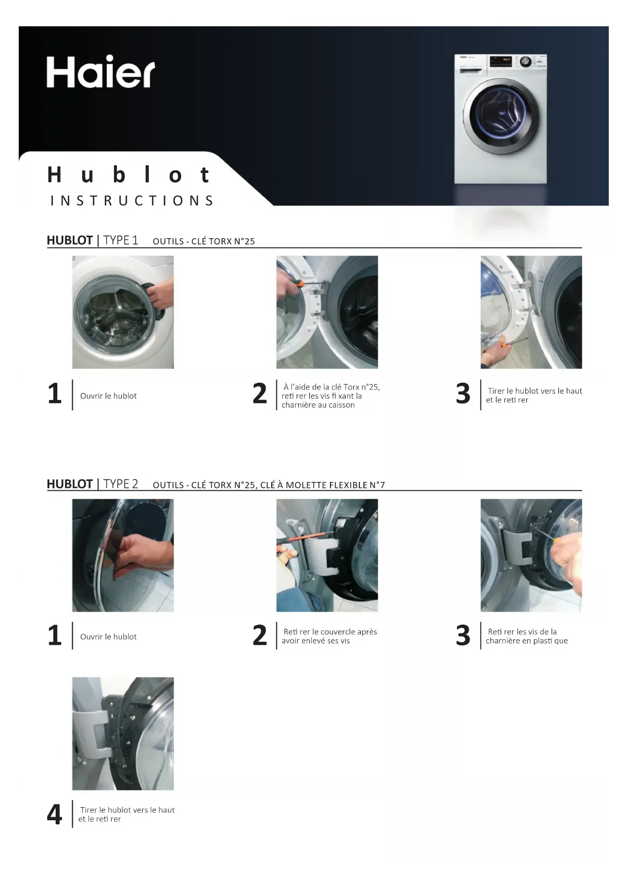 Ouvrir le hublot Re rer le couvercle après avoir enlevé ses vis Re rer les vis de la charnière en plas que Tirer le hublot vers le haut et le re rer Hublot INSTRUCTIONSCHARNIÈRE | TYPE 1 OUTILS - CLÉ TORX N°25