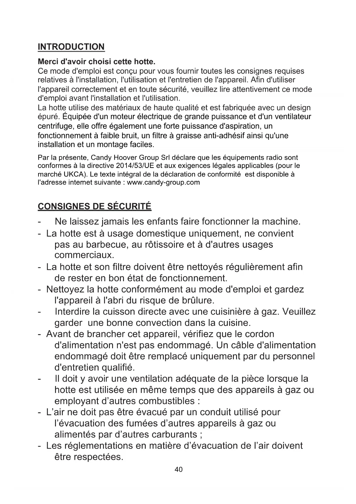 INTRODUCTION Merci d'avoir choisi cette hotte. Ce mode d'emploi est conçu pour vous fournir toutes les consignes requises relatives à l'installation, l'utilisation et l'entretien de l'appareil. Afin d'utiliser l'appareil correctement et en toute sécurité, veuillez lire attentivement ce mode d'emploi avant l'installation et l'utilisation. La hotte utilise des matériaux de haute qualité et est fabriquée avec un design épuré. Équipée d'un moteur électrique de grande puissance et d'un ventilateur centrifuge, elle offre également une forte puissance d'aspiration, un fonctionnement à faible bruit, un filtre à graisse anti-adhésif ainsi qu'une installation et un montage faciles. Par la présente, Candy Hoover Group Srl déclare que les équipements radio sont conformes à la directive 2014/53/UE et aux exigences légales applicables (pour le l'adresse internet suivante : www.candy-group.com