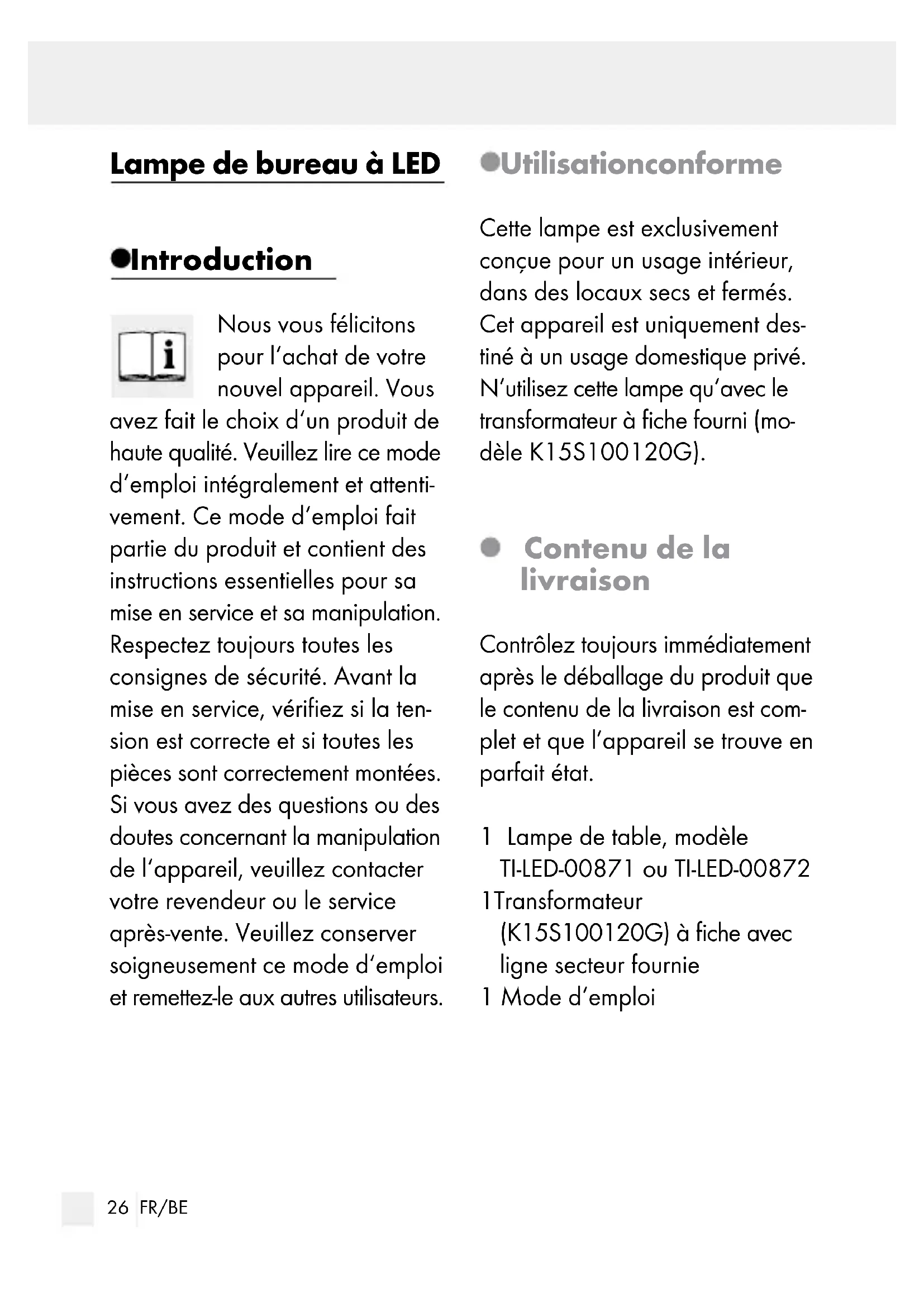 ÂGE! Ne jamais laisser les enfants sans surveillance à proximité de l’emballage. Ils peuvent s‘étouffer avec les matériaux de l‘emballage. Les enfants sous-estiment souvent le danger. Toujours tenir le produit à l‘écart des enfants. Ce produit n’est pas un jouet. Cet appareil peut être utilisé par des enfants à partir de 8 ans ainsi que par des per- sonnes ayant des capacités physiques, psychiques ou sensorielles limitées ou man- quant d‘expérience ou de connaissances, s‘ils sont sur- veillés ou s‘ils ont été informés de l‘utilisation de l‘appareil de manière sûre et comprennent les risques liés à son utilisation. Les enfants ne doivent pas jouer avec cet appareil. Le nettoyage et la maintenance domestique de l’appareil ne doivent pas être effectués par un enfant sans surveillance. Prévention de risques mortels par électrocution Avant chaque utilisation, contrôlez le bon état de la lampe. N‘utilisez jamais la lampe si vous constatez le moindre dommage.29 FR/BE ATTENTION ! Une lampe endommagée implique un danger de mort par électro- cution. Veuillez vous adresser au service après-vente ou à un électricien en cas de dom- mages, réparations ou autres problèmes. Afin d‘éviter tout danger, la ligne extérieure abîmée de cette lampe ne peut être rem- placée que par le constructeur, son représentant de service ou un spécialiste à la qualifi- cation comparable! Assurez-vous avant l‘utilisation que la tension de secteur pré- sente correspond bien à la tension de fonctionnement de la lampe (220–240 V∼, 50 / 60 Hz). Évitez impérativement tout contact de la lampe avec de l‘eau ou d‘autres liquides. Débranchez toujours le trans- formateur à fiche avant le montage, le démontage, le nettoyage ou si vous n‘utilisez pas la lampe pendant une certaine durée. N‘ouvrez jamais les compo- sants électriques, et n‘insérez jamais d‘objets quelconques dans ceux-ci. De telles inter- ventions impliquent un danger de mort par électrocution. L‘ampoule ne peut pas être remplacée. Cette lampe n‘est pas com- patible avec les variateurs ou les interrupteurs électroniques. N‘utilisez cette lampe qu‘avec le transformateur à fiche fourni (modèle K15S100120G). Prévention de risque d‘incendies et de blessures Ne regardez jamais directe- ment dans la source lumineuse (ampoule, LED, etc.). Afin d‘éviter toute brûlure, as- surez-vous que la lampe soit éteinte et refroidie avant de la prendre en main. L‘ampoule dégage une forte chaleur. Ne couvrez pas la lampe ou la fiche secteur avec des ob- jets. Un dégagement de cha- leur excessif peut provoquer un incendie.30 FR/BE Ne laissez jamais fonctionner la lampe sans surveillance. Conduite à tenir Montez la lampe de telle sorte qu‘elle soit protégée de l‘humidité et des salissures. Soyez toujours vigilant ! Faites toujours attention à ce que vous faites et agissez raison- nablement. Ne montez en aucun cas cette lampe si vous n‘êtes pas concentré ou si vous vous sentez mal. Mise en service Retirez tous les films de pro- tection de la lampe de table LED. Installation de la lampe Placez la lampe de table LED sur une surface plane avec le côté arrière dirigé vers vous. Branchez la fiche de connexion de la fiche secteur
