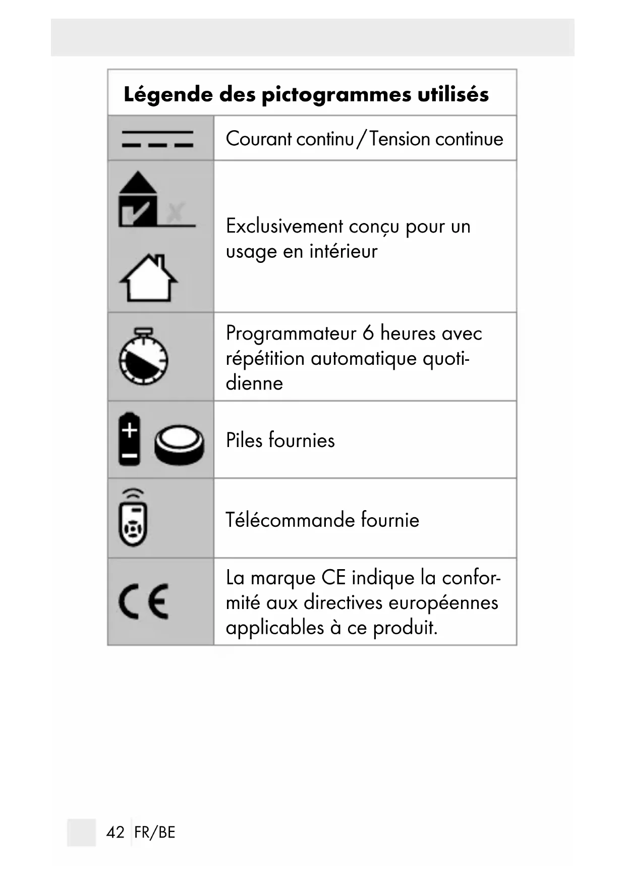 FANTS! L‘ingestion des piles peut provoquer des brûlures chimiques, une perforation du tissu mou et entraîner la mort. Des blessures lourdes peuvent apparaître en l‘espace de 2 heures après l‘ingestion des piles. Consulter immédiatement un mé- decin. La télécommande livrée avec ce produit contient également une pile bouton.48 FR/BE DANGER DE MORT! Rangez les piles / piles rechargeables hors de la portée des enfants. En cas d’ingestion, consultez immé- diatement un médecin ! Une ingestion peut entraîner des brûlures, une perforation des tissus mous et la mort. Des brûlures graves peuvent apparaitre dans les 2 heures suivant l‘ingestion. RISQUE D‘EXPLOSION ! Ne rechargez jamais des piles non rechargeables. Ne court-circuitez pas les piles / piles rechargeables et / ou ne les ouvrez pas ! Autrement, vous risquez de provoquer une surchauffe, un incendie ou une explosion. Ne jetez jamais des piles / piles rechargea- bles au feu ou dans l’eau. Ne pas soumettre les piles / piles rechar- geables à une charge mécanique. Risque de fuite des piles / piles rechargeables Évitez d’exposer les piles / piles rechargea- bles à des conditions et températures ex- trêmes susceptibles de les endommager, par ex. sur des radiateurs / exposition directe aux rayons du soleil.49 FR/BE Lorsque les piles / piles rechargeables fuient, évitez tout contact du produit chimique avec la peau, les yeux ou les muqueuses! Rincez les zones touchées à l‘eau claire et consultez immédiatement un médecin !
