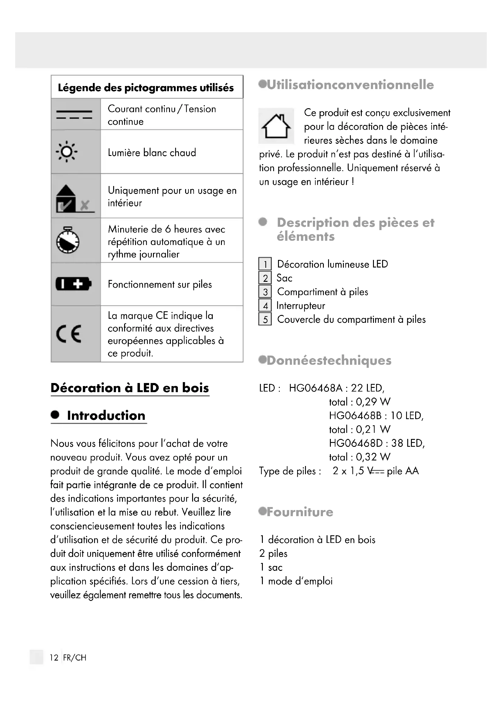 Couvercle du compartiment à piles Données techniques LED : HG06468A: 22 LED, total: 0,29 W HG06468B: 10 LED, total: 0,21 W HG06468D: 38 LED, total: 0,32 W Type de piles: 2 x 1,5 V pile AA Fourniture 1 décoration à LED en bois 2 piles 1 sac 1 mode d‘emploi13 FR/CH Indications de sécurité