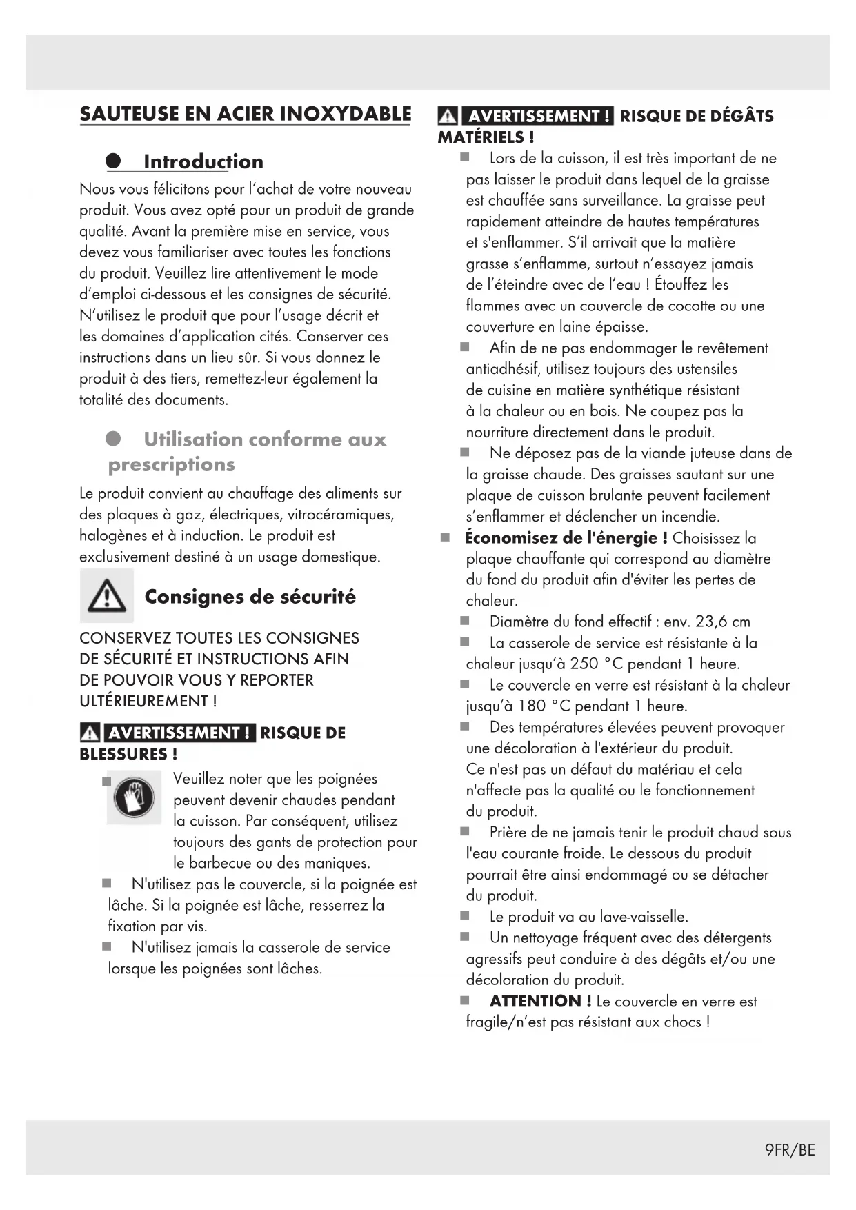 MATÉRIELS! Lors de la cuisson, il est très important de ne pas laisser le produit dans lequel de la graisse est chauffée sans surveillance. La graisse peut rapidement atteindre de hautes températures et s'enflammer. S’il arrivait que la matière grasse s’enflamme, surtout n’essayez jamais de l’éteindre avec de l’eau! Étouffez les flammes avec un couvercle de cocotte ou une couverture en laine épaisse. Afin de ne pas endommager le revêtement antiadhésif, utilisez toujours des ustensiles de cuisine en matière synthétique résistant à la chaleur ou en bois. Ne coupez pas la nourriture directement dans le produit. Ne déposez pas de la viande juteuse dans de la graisse chaude. Des graisses sautant sur une plaque de cuisson brulante peuvent facilement s’enflammer et déclencher un incendie. Économisez de l'énergie! Choisissez la plaque chauffante qui correspond au diamètre du fond du produit afin d'éviter les pertes de chaleur. Diamètre du fond effectif: env. 23,6cm La casserole de service est résistante à la chaleur jusqu’à 250°C pendant 1heure. Le couvercle en verre est résistant à la chaleur jusqu’à 180°C pendant 1heure. Des températures élevées peuvent provoquer une décoloration à l'extérieur du produit. Ce n'est pas un défaut du matériau et cela n'affecte pas la qualité ou le fonctionnement du produit. Prière de ne jamais tenir le produit chaud sous l'eau courante froide. Le dessous du produit pourrait être ainsi endommagé ou se détacher du produit. Le produit va au lave-vaisselle. Un nettoyage fréquent avec des détergents agressifs peut conduire à des dégâts et/ou une décoloration du produit. ATTENTION! Le couvercle en verre est fragile/n’est pas résistant aux chocs!10 FR/BE Si vous lavez le produit à la main, utilisez de l'eau chaude avec du liquide vaisselle courant disponible dans le commerce. Évitez d'utiliser des objets tranchants ou pointus afin de ne pas endommager les matériaux. Il est important de ne pas tirer ou pousser le produit sur des plaques de cuisson en vitrocéramique et halogène. Ne pas respecter cette consigne peut provoquer des rayures. Remarque pour les plaques de cuisson à induction Remarque: Dans certaines circonstances, un bruit peut apparaître qui est dû aux qualités électromagnétiques de la source de chaleur et du produit. Cela est normal et n'indique pas un défaut de votre plaque de cuisson à induction ou du récipient de cuisson. Le produit doit être centré sur la plaque de cuisson à induction. ATTENTION! Vitesse de chauffage élevée! Le récipient de cuisson ne doit pas être soumis à de fortes températures lors du préchauffage. En cas de surchauffe, la pièce doit être bien aérée. Pour que le produit fonctionne correctement, veuillez toujours le placer sur la plaque de cuisson qui correspond au diamètre réel du fond indiqué dans ce mode d’emploi. Utilisation Avant la première utilisation, veuillez retirer tous les autocollants du produit et le rincer à l'eau chaude. Prévoyez avant la première utilisation de faire bouillir de l’eau 2à 3fois dans le produit afin d’éliminer complètement les résidus de fabrication éventuels. Prière de ne pas trop chauffer le produit rempli avec des aliments ou à vide car la surchauffe peut causer des dommages à la surface antiadhésive ou au revêtement. Mise au rebut L’emballage se compose de matières recyclables pouvant être mises au rebut dans les déchetteries locales. Votre mairie ou votre municipalité vous renseigneront sur les possibilités de mise au rebut des produits usagés. Garantie Le produit a été fabriqué selon des critères de qualité stricts et contrôlé consciencieusement avant sa livraison. En cas de défaillance, vous êtes en droit de retourner ce produit au vendeur. La présente garantie ne constitue pas une restriction de vos droits légaux. Ce produit bénéficie d‘une garantie de 3 ans à compter de sa date d’achat. La durée de garantie débute à la date d’achat. Veuillez conserver le ticket de caisse original. Il fera office de preuve d’achat. Si un problème matériel ou de fabrication devait survenir dans 3 ans suivant la date d‘achat de ce produit, nous assurons à notre discrétion la réparation ou le remplacement du produit sans frais supplémentaires. La garantie prend fin si le produit est endommagé suite à une utilisation inappropriée ou à un entretien défaillant. La garantie couvre les vices matériels et de fabrication. Cette garantie ne s’étend ni aux pièces du produit soumises à une usure normale (p. ex. des piles) et qui, par conséquent, peuvent être considérées comme des pièces d’usure, ni aux dommages sur des composants fragiles, comme des interrupteurs, des batteries ou des éléments fabriqués en verre.11FR/BE Faire valoir sa garantie Pour garantir la rapidité d’exécution de la procédure de garantie, veuillez respecter les indications suivantes : Veuillez conserver le ticket de caisse et la référence du produit (par ex. IAN 123456_7890) à titre de preuve d’achat pour toute demande. Le numéro de référence de l’article est indiqué sur la plaque d’identification, gravé sur la page de titre de votre manuel (en bas à gauche) ou sur un autocollant apposé sur la face arrière ou inférieure du produit. En cas de dysfonctionnement du produit, ou de tout autre défaut, contactez en premier lieu le service après-vente par téléphone ou par e-mail aux coordonnées indiquées ci-dessous. Vous pouvez alors envoyer franco de port tout produit considéré comme défectueux au service clientèle indiqué, accompagné de la preuve d’achat (ticket de caisse) et d’une description écrite du défaut avec mention de sa date d’apparition. Service après-vente Service après-vente France Tél.: 0800904879 E-Mail: owim@lidl.fr Service après-vente Belgique Tél.: 080071011 Tél.: 80023970 (Luxembourg) E-Mail: owim@lidl.be12 NL/BE ROEST