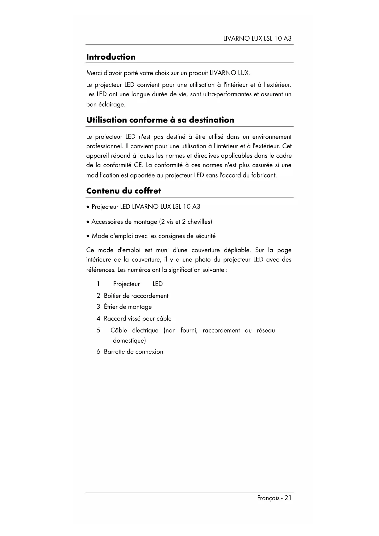 - Remarques sur la garantie et en cas d'intervention technique LIVARNO LUX LSL 10 A3 Français - 21 Introduction Merci d'avoir porté votre choix sur un produit LIVARNO LUX. Le projecteur LED convient pour une utilisation à l'intérieur et à l'extérieur. Les LED ont une longue durée de vie, sont ultra-performantes et assurent un bon éclairage. Utilisation conforme à sa destination Le projecteur LED n'est pas destiné à être utilisé dans un environnement professionnel. Il convient pour une utilisation à l'intérieur et à l'extérieur. Cet appareil répond à toutes les normes et directives applicables dans le cadre de la conformité CE. La conformité à ces normes n'est plus assurée si une modification est apportée au projecteur LED sans l'accord du fabricant. Contenu du coffret Projecteur LED LIVARNO LUX LSL 10 A3 Accessoires de montage (2 vis et 2 chevilles) Mode d'emploi avec les consignes de sécurité Ce mode d'emploi est muni d'une couverture dépliable. Sur la page intérieure de la couverture, il y a une photo du projecteur LED avec des références. Les numéros ont la signification suivante : 1 Projecteur LED 2 Boîtier de raccordement 3 Étrier de montage 4 Raccord vissé pour câble 5 Câble électrique (non fourni, raccordement au réseau domestique) 6 Barrette de connexionLIVARNO LUX LSL 10 A3 p. 28
