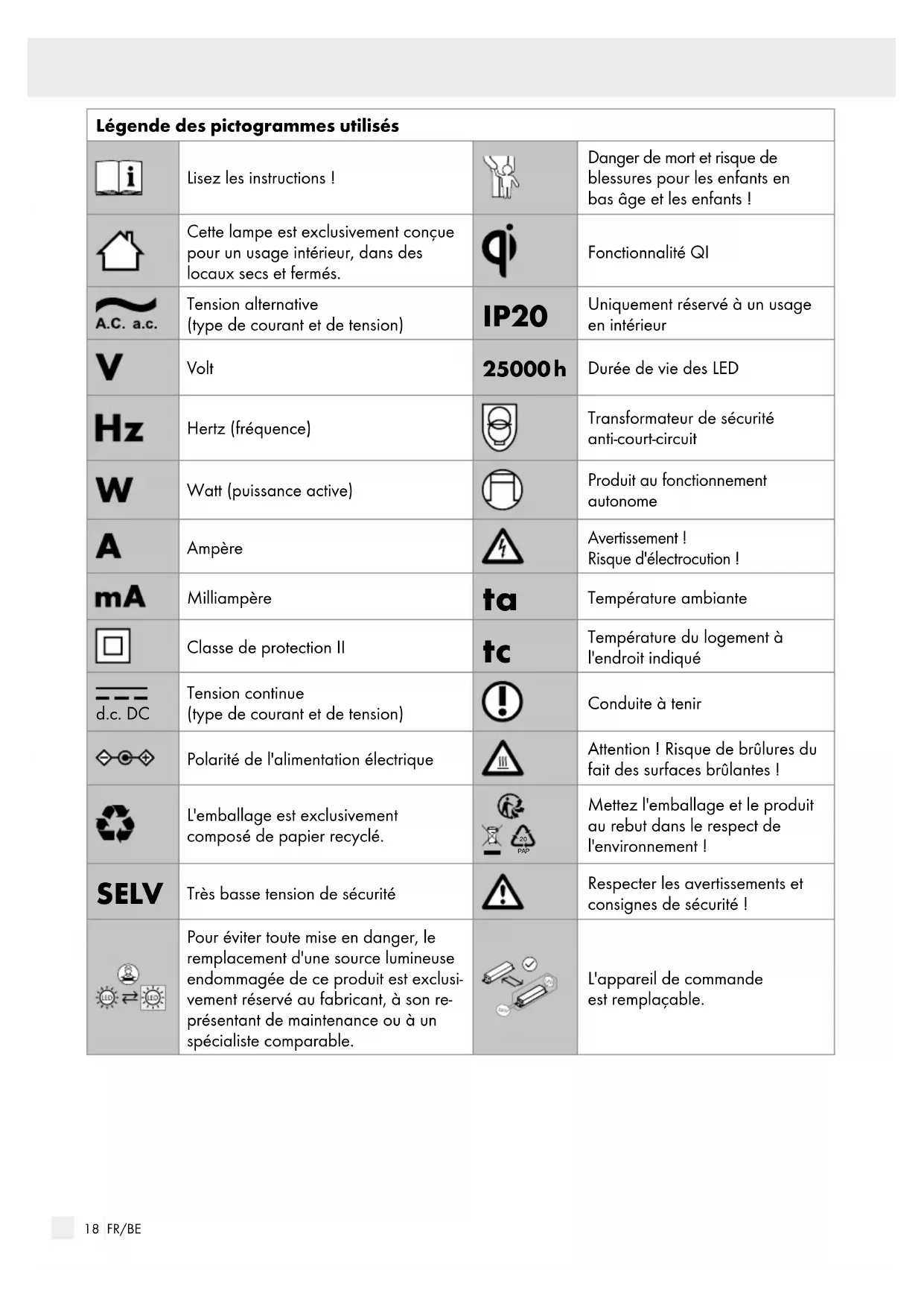 PAP Mettez l'emballage et le produit au rebut dans le respect de l'environnement ! SELV Très basse tension de sécurité Respecter les avertissements et consignes de sécurité ! Pour éviter toute mise en danger, le remplacement d'une source lumineuse endommagée de ce produit est exclusi- vement réservé au fabricant, à son re- présentant de maintenance ou à un spécialiste comparable. L'appareil de commande est remplaçable.19 FR/BE IntroductionLégende des pictogrammes utilisés Lampe de table à LED Introduction Nous vous félicitons pour l‘achat de votre nouvel appareil. Vous avez opté pour un produit de grande qualité. La notice d‘uti- lisation fait partie intégrante de celui-ci. Elle contient des indications importantes pour la sécurité, l‘utilisation et le traitement des déchets. Avant d‘utiliser le produit, veuillez prendre connaissance de toutes les indications d’utilisation et de sécurité. Utilisez ce produit unique- ment conformément aux instructions et dans les do- maines d’application spécifiés. Lorsque vous remettez l‘appareil à d‘autres utilisateurs, veuillez également leur transmettre tous les documents liés à celui-ci. Avant la mise en service, vérifiez si la tension est correcte et si toutes les pièces sont correctement montées.