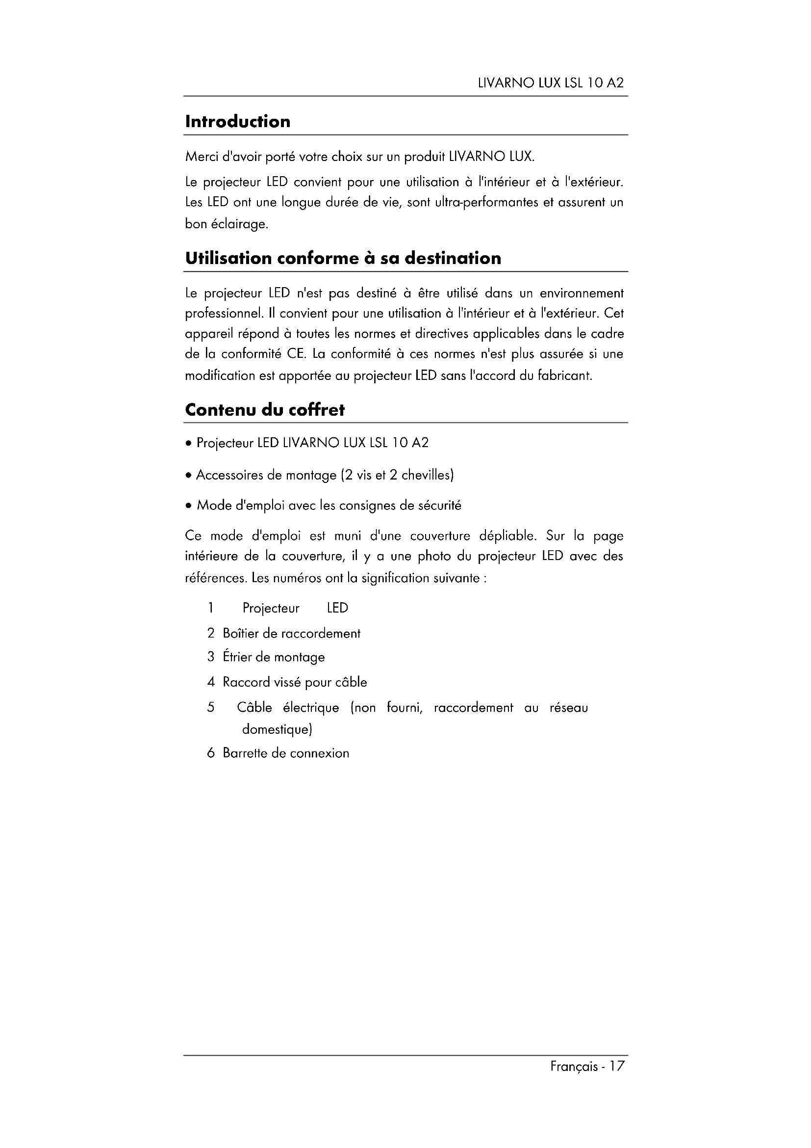 - Remarques sur la garantie et en cas d'intervention technique LIVARNO LUX LSL 10 A2 Français - 17 Introduction Merci d'avoir porté votre choix sur un produit LIVARNO LUX. Le projecteur LED convient pour une utilisation à l'intérieur et à l'extérieur. Les LED ont une longue durée de vie, sont ultra-performantes et assurent un bon éclairage. Utilisation conforme à sa destination Le projecteur LED n'est pas destiné à être utilisé dans un environnement professionnel. Il convient pour une utilisation à l'intérieur et à l'extérieur. Cet appareil répond à toutes les normes et directives applicables dans le cadre de la conformité CE. La conformité à ces normes n'est plus assurée si une modification est apportée au projecteur LED sans l'accord du fabricant. Contenu du coffret Projecteur LED LIVARNO LUX LSL 10 A2 Accessoires de montage (2 vis et 2 chevilles) Mode d'emploi avec les consignes de sécurité Ce mode d'emploi est muni d'une couverture dépliable. Sur la page intérieure de la couverture, il y a une photo du projecteur LED avec des références. Les numéros ont la signification suivante : 1 Projecteur LED 2 Boîtier de raccordement 3 Étrier de montage 4 Raccord vissé pour câble 5 Câble électrique (non fourni, raccordement au réseau domestique) 6 Barrette de connexionLIVARNO LUX LSL 10 A2 p. 22