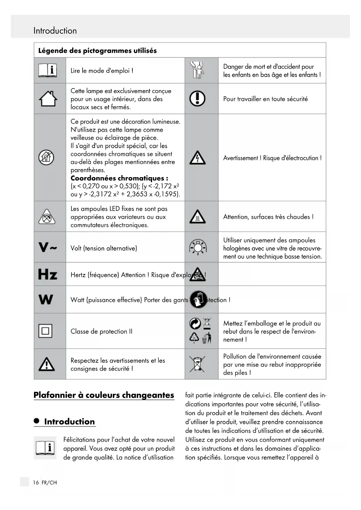 ET LES ENFANTS EN BAS ÂGE! Ne jamais laisser les enfants sans surveillance avec le matériel d’emballage. L’emballage pré- sente un risque d’étouffement. Les enfants sous-estiment souvent le danger. Toujours tenir le produit à l’écart des enfants. Ce produit peut être utilisé par des enfants âgés de 8 ans et plus ainsi que par des personnes ayant des capacités physiques, sensorielles ou mentales réduites ou manquant d’expérience ou de connaissances, s’ils sont surveillés ou s’ils ont été informés de l’utilisation sûre du pro- duit et comprennent les risques liés à son utili- sation. Les enfants ne doivent pas jouer avec ce produit. Le nettoyage et l’entretien du produit ne doivent pas être effectués par des enfants lais- sés sans surveillance. ATTENTION ! Dans certaines circonstances, la rapidité extrême du changement de lumière peut occasionner des troubles de la vue chez les enfants ou chez les personnes sensibles (par ex. en raison de pa- thologies psychiques). Prévention de risques mortels par électrocution Classe de protection II / . Ce luminaire est isolé de manière spécifique et ne doit pas être connecté à un conducteur de protection. L’installation électrique doit être effectuée par un électricien ou par une personne dûment formée à cet effet. De même, toute responsabilité est déclinée pour les dommages matériels ou corporels causés par une manipulation incorrecte ou le non-respect des consignes de sécurité ! N’utilisez jamais votre lampe si vous constatez le moindre endommagement. Avant le montage, retirez le fusible ou coupez le disjoncteur de la boîte à fusibles (position 0). Évitez impérativement tout contact de la lampe avec de l’eau ou d’autres liquides. Avant d’effectuer le montage, assurez vous que la tension secteur corresponde à la tension de fonctionnement de la lampe requise (voir «Caractéristiques techniques»). Assurez-vous lors du montage qu’aucun câble ne soit endommagé. Ne montez pas la lampe sur des surfaces de support humides ou conductrices. N’ouvrez jamais les composants électriques, et n’insérez jamais d’objets quelconques dans ceux-ci. De telles interventions impliquent un danger de mort par électrocution. Prévention de risque d’incendies et de blessures Afin d’éviter toute brûlure, assurez-vous que la lampe soit éteinte et refroidie avant de la prendre en main. L’ampoule dégage une forte chaleur au niveau du logement de la lampe. ATTENTION ! L’ampoule et des éléments de la lampe peuvent atteindre des températures > 90 °C lorsque la lampe est allumée ; il faut alors éviter tout contact. Laissez complètement refroidir la lampe avant de remplacer une ampoule défectueuse. Remplacez immédiatement toute ampoule dé- fectueuse par une ampoule neuve. Utilisez uni- quement les ampoules spécifiées au chapitre «Caractéristiques techniques». Avant de rem- placer l’ampoule, retirez toujours pour commencer le fusible ou coupez le disjoncteur de la boîte à fusible. Les LED sont fixes et ne peuvent pas être remplacées. Sécurité19 FR/CH Sécurité Sécurité Ne regardez jamais directement dans la source lumineuse (ampoule, LED, etc.). Ne pas observer les LED à l’aide d’un instru- ment optique (par exemple une loupe). Pour travailler en toute sécurité Utilisez uniquement le type d’ampoule halogène décrit au chapitre «Caractéristiques techniques». Ne pas toucher les lampes halogènes à main n ue. Si cela devait toutefois se produire, l’ampoule devrait alors être essuyée avec de l’alcool et un chiffon non pelucheux. Utilisez uniquement des ampoules halogènes avec une vitre de recouvre- ment ou une technique basse tension. Montez la lampe de telle sorte qu’elle soit protégée de l’humidité et des salissures. Préparez soigneusement le montage et effec- tuez-le sans précipitation. Préparez toutes les pièces détachées et l’outillage ou le matériel requis et posez-les à portée de main. Soyez toujours vigilant ! Faites toujours attention à ce que vous faites et agissez raisonnablement. N’effectuez jamais le montage de la lampe si vous n’êtes pas concentré ou si vous vous sen- tez mal. Consignes de sécurité relatives aux piles / aux piles rechargeables CONSERVER LES
