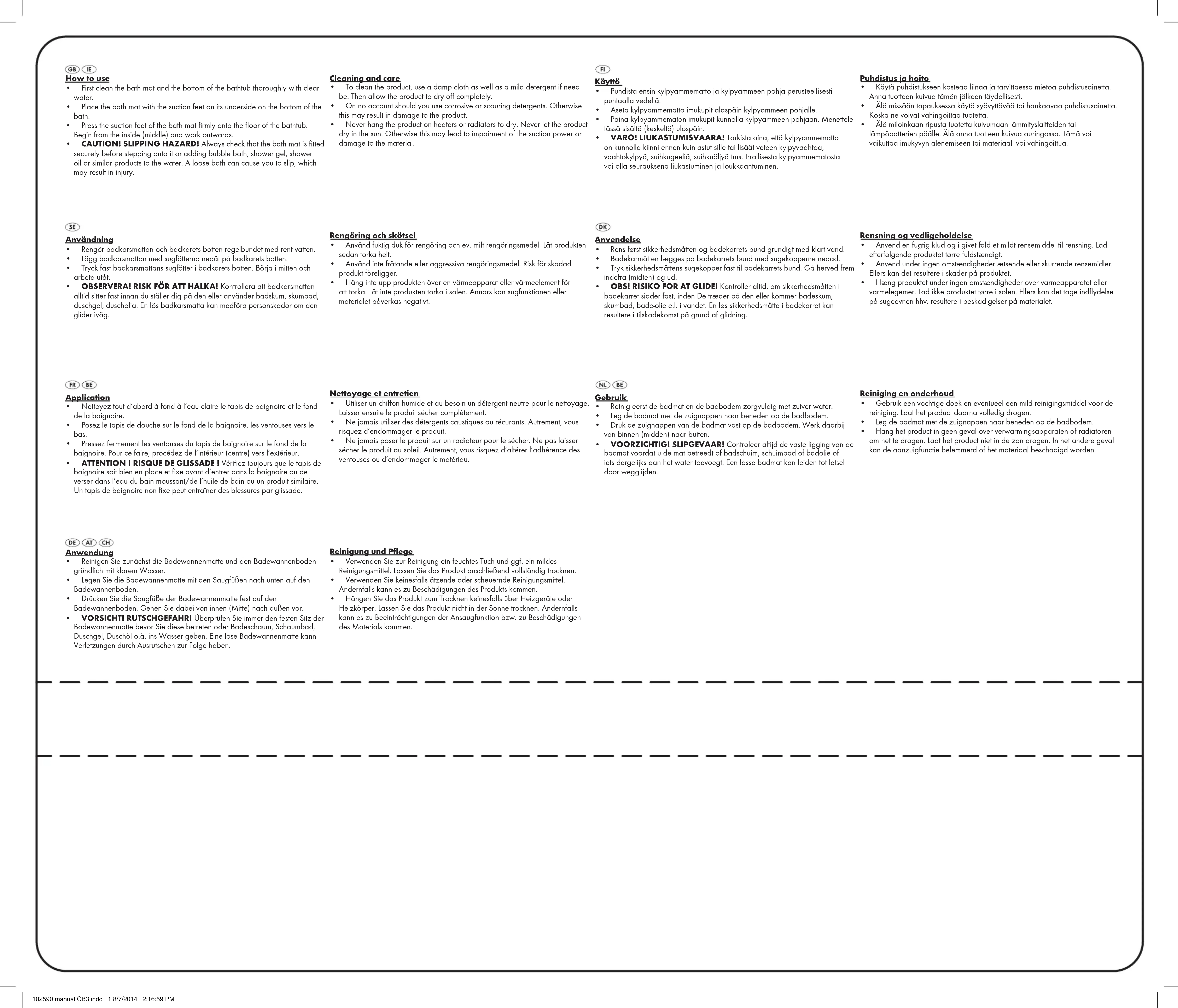 Nettoyage hout d'abord à fond à faible eau claires le tope de baignoire et la fond de la brounne. Poser tapis de douche sur le fond de la baignoire, les ventouses vers le bas. Poeie enfin 1000000000000000000000000000000000000000000000000000000000000000000000000000 ATTENTION I RISQUE DE GLISSADE I VÉRIFIEZ QUE le tope de baignoire est lié à un plan et le rendu d'un autre dans la baignoire qui ne veille dans l'eau ou bain moussant, ce produit de bain ou un produit similaire. I tâche duinon ne peut non être contrés des blessures par glissade.
