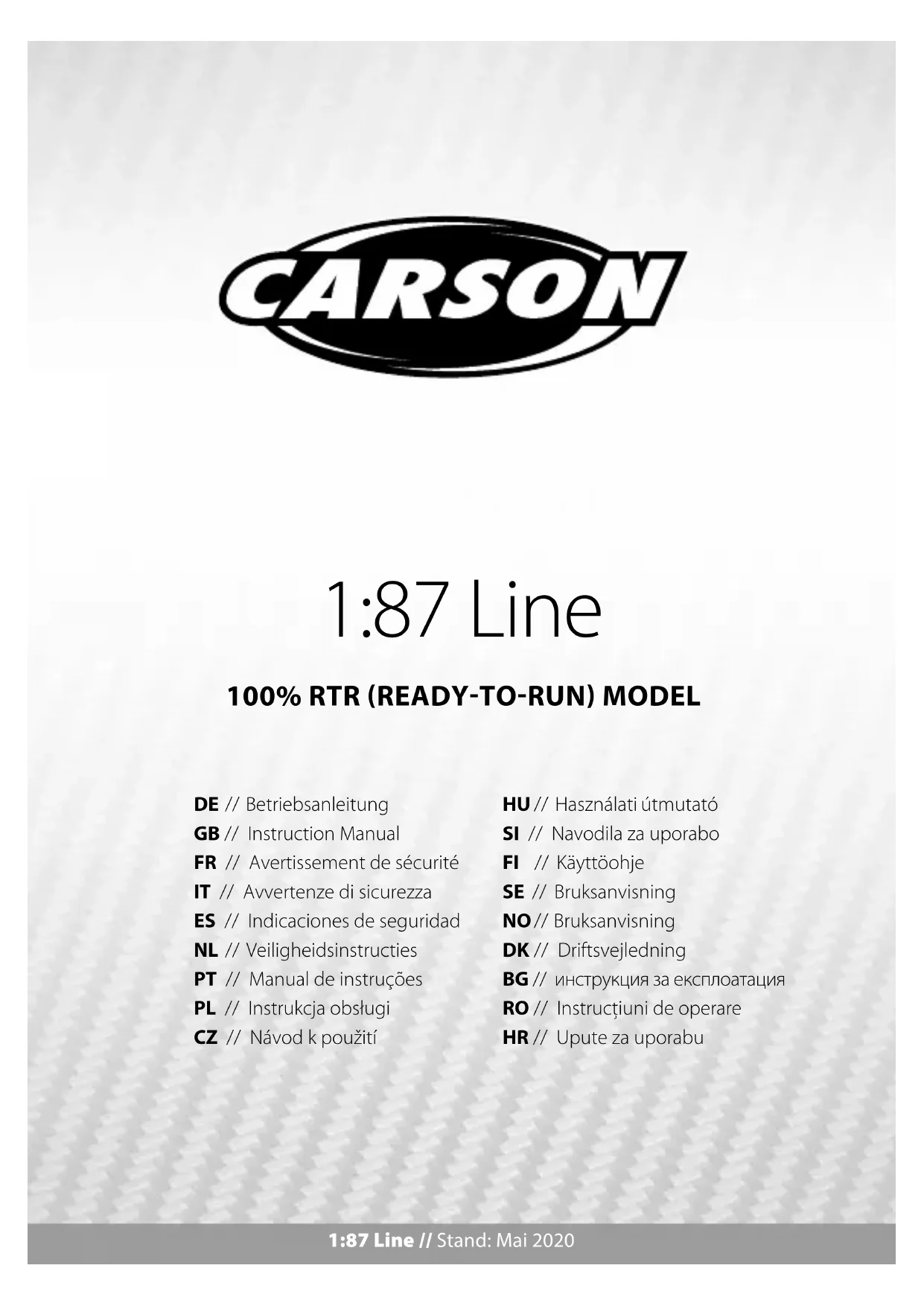 or unusable cells must be disposed of in the correct manner. No liability for printing errors, we reserve the right to make changes!FR // 8 Déclaration de conformité: La société TAMIYA-CARSON Modellbau GmbH & Co. KG atteste que le type d’équipement hertzien 1:87 Line est conforme à la directive 2014/53/EU. Le test complet de la déclaration de conformité européenne est disponible à l’adresse suivante : www.carson-modelsport.com/de/produkte.htm Garantie: www.carson-modelsport.com/de/service/ gewaehrleistung/ Puissance de transmission maximale: 10 mW Signification du symbole sur le produit, l’emballage ou le mode d‘emploi: les appareils électriques sont des biens potentiellement recyclables qui ne doivent pas être jetés aux ordures ménagères une fois usés. Aidez-nous à protéger notre environnement et à économiser nos ressources et remettez cet appareil à un lieu de collecte approprié. Pour toute question, veuillez vous adresser à votre distributeur ou à l‘organisme compétent pour l‘élimintation des déchets. Précautions (informations à conserver !) IMPORTANT ! Ne convient pas aux enfants de moins de 3 ans. Risque d’asphyxie lié à la présence de pièces de petite taille susceptibles d‘être avalées. Risque de strangulation lié au câble. Veuillez conserver ces informations en prévision d’une éventuelle correspondance. Sous réserve de modifications techniques et de variations de couleurs. L’aide d’adultes est indispensable pour retirer les dispositifs protégeant l’appareil lors du transport. Ne jamais soulever le véhicule tant que les roues tournent. Ne pas approcher les doigts, la chevelure et les vêtements lâches du moteur ou des roues lorsque l’appareil est sur « ON ». Pour éviter toute mise en marche intempestive, retirez, si possible, les piles et les accus du jouet lorsque vous ne vous en servez pas. L’émetteur doit être mis en marche avant le véhicule afin d’éviter toute mise en marche inopinée du véhicule (sous réserve de modifications). Lors de la mise à l’arrêt, toujours éteindre le véhicule en premier puis l’émetteur. Utilisez exclusivement les piles prévues à cet effet ! Insérez les piles de telle sorte que les pôles positifs et négatifs se trouvent au bon endroit ! Ne jetez jamais les piles usagées avec les déchets ménagers : déposez-les dans une borne de collecte ou bien dans un centre de récupération des déchets toxiques. Lorsque les piles sont vides, retirez-les du jouet. Les piles non rechargeables ne doivent pas être rechargées. Pour recharger des piles rechargeables, retirez-les préalablement du jouet lorsque cela est possible. Les piles rechargeables doivent être rechargées seulement par des adultes. N’utilisez pas en même temps de piles de différent type ou des piles neuves et usagées. Ne court-circuitez pas les barrettes de liaison. Ne mélangez pas des piles usagées et neuves. Ne mélangez pas des piles alcalines, standard (zinc-carbone) et rechargeables. Pour un fonctionnement optimal du véhicule, il est conseillé d’utiliser uniquement des piles alcalines ou des accus rechargeables. Vérifiez régulièrement le chargeur pour vous assurer qu’il n’est pas abîmé. Si le chargeur est abîmé, ne l’utilisez plus tant qu’il n’est pas complètement réparé. Procédez à la recharge uniquement dans des endroits secs ; protégez l’appareil de l’humidité. Nous déclinons toute responsabilité en cas de pertes de données, de dégradations du logiciel ou d’autres dégradations de l’ordinateur ou des accessoires entraînés par la recharge de la pile. N’insérez pas de câbles dans les prises de courant. Le jouet ne doit être relié qu’à des appareils de classe II présentant le symbole suivant : Attention: Avant de mettre en service le produit ou de commander des pièces détachées, assurez-vous que vous possédez bien la dernière version du manuel. Ce manuel contient des indications techniques, des instructions importantes pour bien mettre en service et utiliser l’appareil, ainsi que des informations sur le produit correspondant à l’état des connaissances à la date d’impression. Le contenu du manuel et les caractéristiques techniques du produit peuvent être modifiées sans annonce préalable. Vous trouverez la version actuelle du manuel à l’adresse suivante: www.carson-modelsport.com9 // FR Avertissement de sécurité accus lithium: