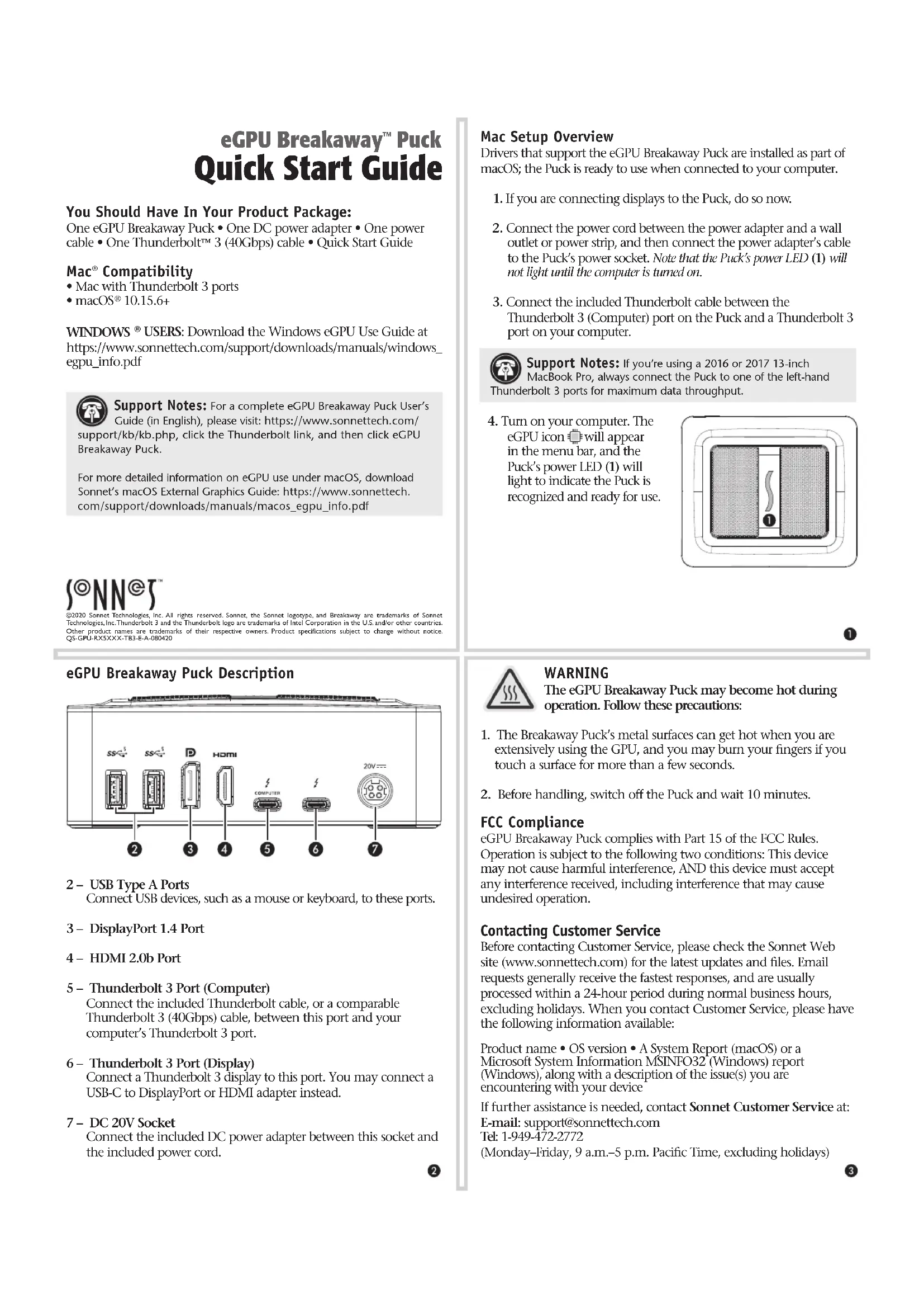 FCC Compliance Cet appareil est conforme à la Section 15 du règlement de la FCC (Commission Fédérale des Communications des États-Unis). Son fonctionnement est assujetti aux deux conditions suivantes : (1) Cet appareil ne peut pas causer d’interférence nuisible et (2) cet appareil doit accepter toutes les interférences reçues, y compris celles qui risquent d’entraîner un fonctionnement non désiré. Service clientèle Avant de contacter le service clientèle, veuillez consulter notre site Web (www.sonnettech.com) pour connaître les dernières mises à jour et les fichiers. Les demandes d’assistance par courrier électronique reçoivent les réponses les plus rapides et sont traitées dans les 24 heures pendant les heures normales de bureau, et non les jours fériés. Lorsque vous contactez le service clientèle, veuillez avoir les informations suivantes a votre disposition : Nom du produit • Version OS • Un rapport système (macOS) ou un rapport Microsoft System Information MSINFO32 (Windows), avec une description du ou des problèmes que vous rencontrez avec votre périphérique. Si vous avez besoin de plus d’assistance, veuillez nous contacter à l’adresse suivante : E-mail : support@sonnettech.com Téléphone : +1-949-472-2772 (Du lundi au vendredi de 9h à 17h PST, et non les jours fériés) Vous devriez avoir reçu dans l'emballage du produit : Un eGPU Breakaway Puck • Un adaptateur d’alimentation • Un câble d’alimentation • Un câble Thunderbolt