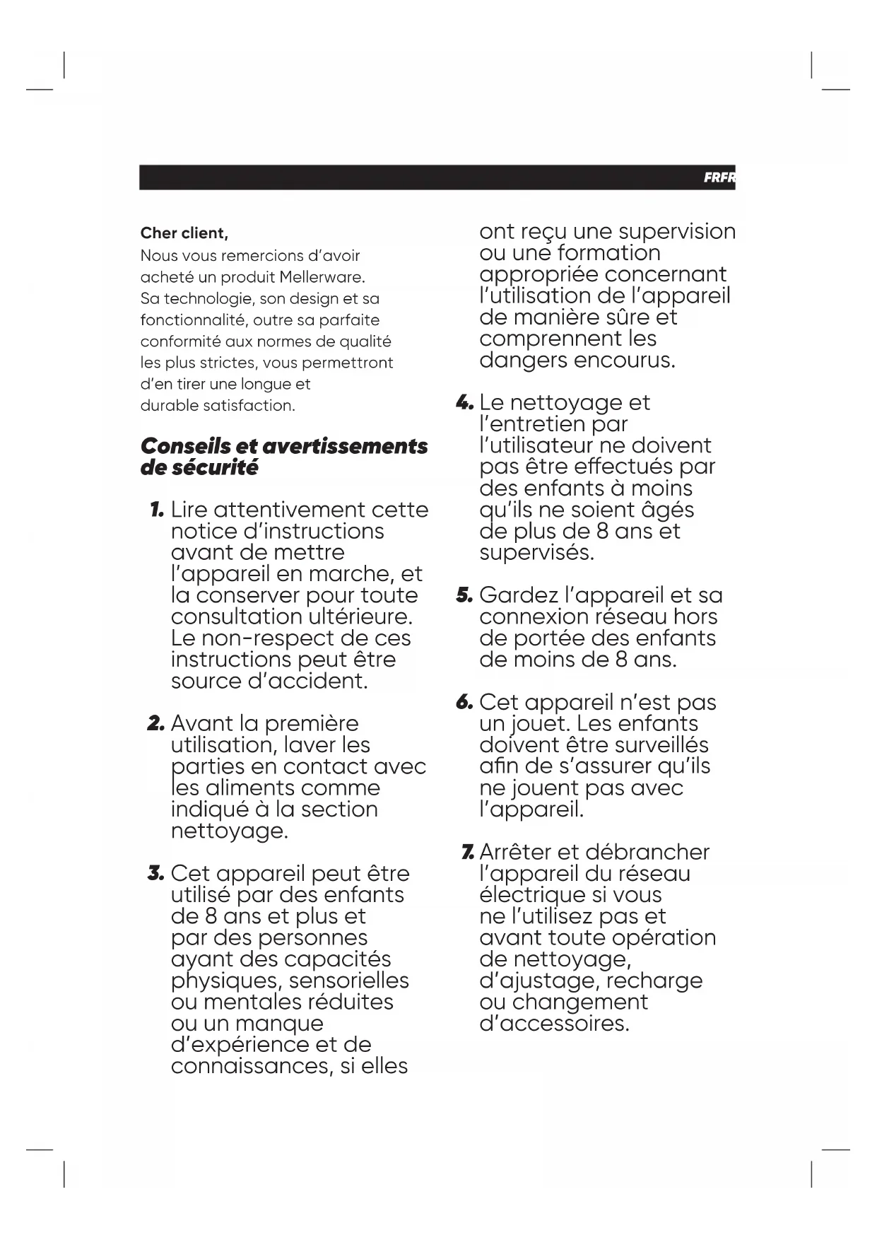 –ES FRFRANÇAIS Cher client, Nous vous remercions d’avoir acheté un produit Mellerware. Sa technologie, son design et sa fonctionnalité, outre sa parfaite conformité aux normes de qualité les plus strictes, vous permettront d’en tirer une longue et durable satisfaction. Lire attentivement cette notice d’instructions avant de mettre l’appareil en marche, et la conserver pour toute consultation ultérieure. Le non-respect de ces instructions peut être source d’accident. Avant la première utilisation, laver les parties en contact avec les aliments comme indiqué à la section nettoyage. Cet appareil peut être utilisé par des enfants de 8 ans et plus et par des personnes ayant des capacités physiques, sensorielles ou mentales réduites ou un manque d’expérience et de connaissances, si elles Conseils et avertissements de sécurité ont reçu une supervision ou une formation appropriée concernant l’utilisation de l’appareil de manière sûre et comprennent les dangers encourus. Le nettoyage et l’entretien par l’utilisateur ne doivent pas être eectués par des enfants à moins qu’ils ne soient âgés de plus de 8 ans et supervisés. Gardez l’appareil et sa connexion réseau hors de portée des enfants de moins de 8 ans. Cet appareil n’est pas un jouet. Les enfants doivent être surveillés an de s’assurer qu’ils ne jouent pas avec l’appareil. Arrêter et débrancher l’appareil du réseau électrique si vous ne l’utilisez pas et avant toute opération de nettoyage, d’ajustage, recharge ou changement d’accessoires.