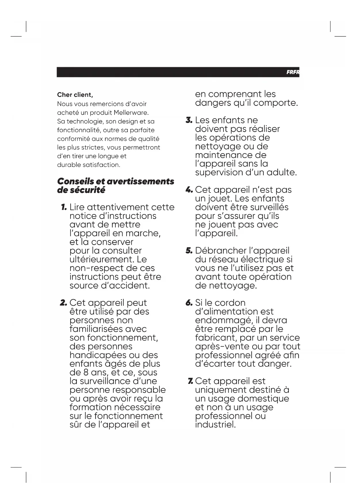 –FRFRANÇAIS Cher client, Nous vous remercions d’avoir acheté un produit Mellerware. Sa technologie, son design et sa fonctionnalité, outre sa parfaite conformité aux normes de qualité les plus strictes, vous permettront d’en tirer une longue et durable satisfaction. Lire attentivement cette notice d’instructions avant de mettre l’appareil en marche, et la conserver pour la consulter ultérieurement. Le non-respect de ces instructions peut être source d’accident. Cet appareil peut être utilisé par des personnes non familiarisées avec son fonctionnement, des personnes handicapées ou des enfants âgés de plus de 8 ans, et ce, sous la surveillance d’une personne responsable ou après avoir reçu la formation nécessaire sur le fonctionnement sûr de l’appareil et Conseils et avertissements de sécurité en comprenant les dangers qu’il comporte. Les enfants ne doivent pas réaliser les opérations de nettoyage ou de maintenance de l’appareil sans la supervision d’un adulte. Cet appareil n’est pas un jouet. Les enfants doivent être surveillés pour s’assurer qu’ils ne jouent pas avec l’appareil. Débrancher l’appareil du réseau électrique si vous ne l’utilisez pas et avant toute opération de nettoyage. Si le cordon d’alimentation est endommagé, il devra être remplacé par le fabricant, par un service après-vente ou par tout professionnel agréé an d’écarter tout danger. Cet appareil est uniquement destiné à un usage domestique et non à un usage professionnel ou industriel.